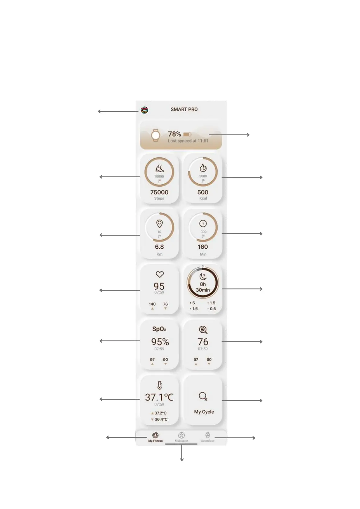 Titan SMART PRO - Application Dashboard; Health Metrics Overview; Activity and Sleep Tracking; Device Status and Navigation