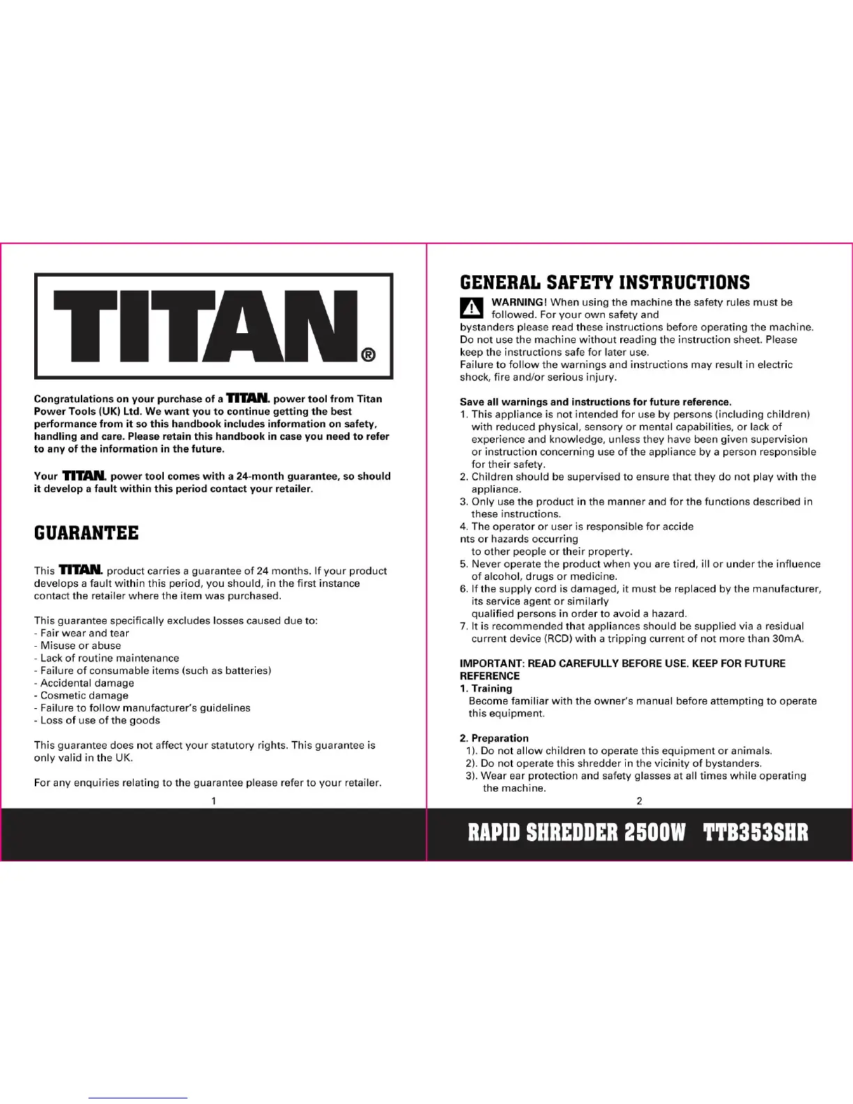 Titan TTB353SHR - GENERAL SAFETY INSTRUCTIONS; User Responsibility and Safe Practices