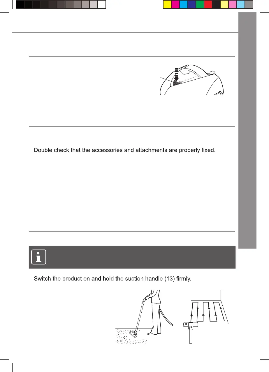 > Attach the desired attachment onto the suction handle (13) / suction tube (14).
