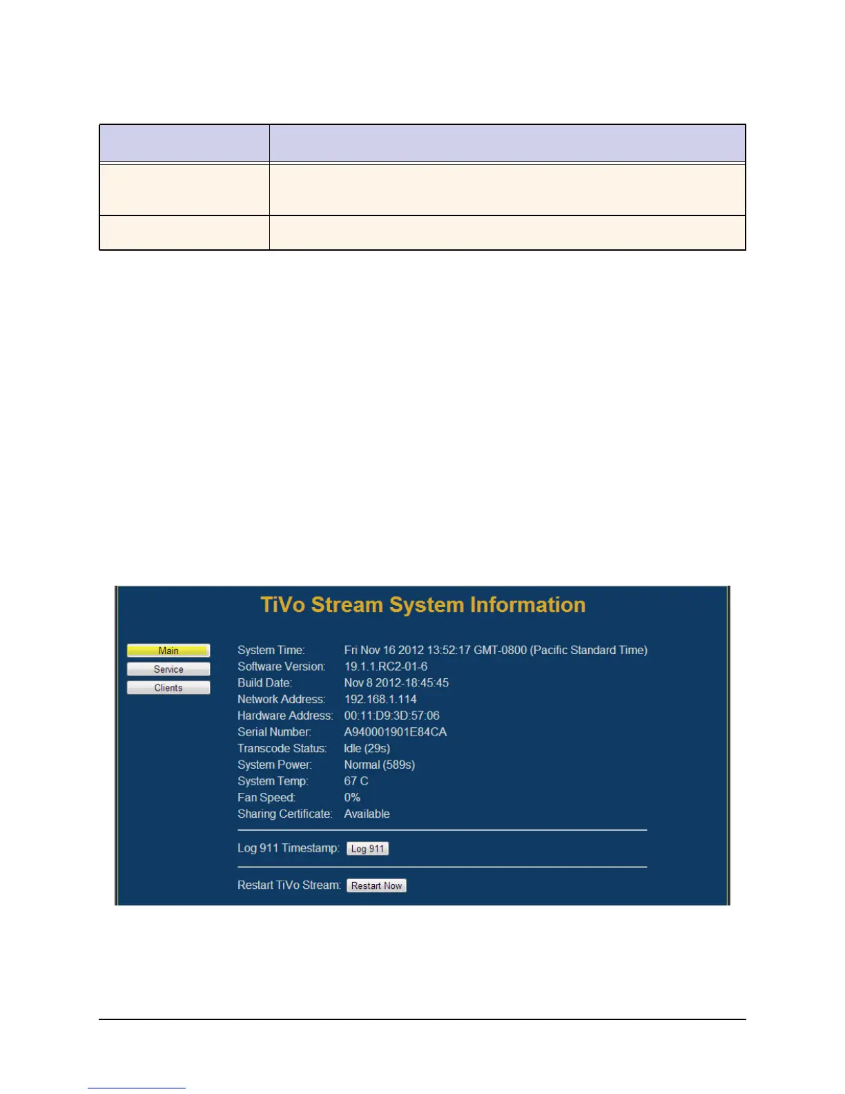 Figure 3–25: TiVo Stream System Information web page (Main tab)