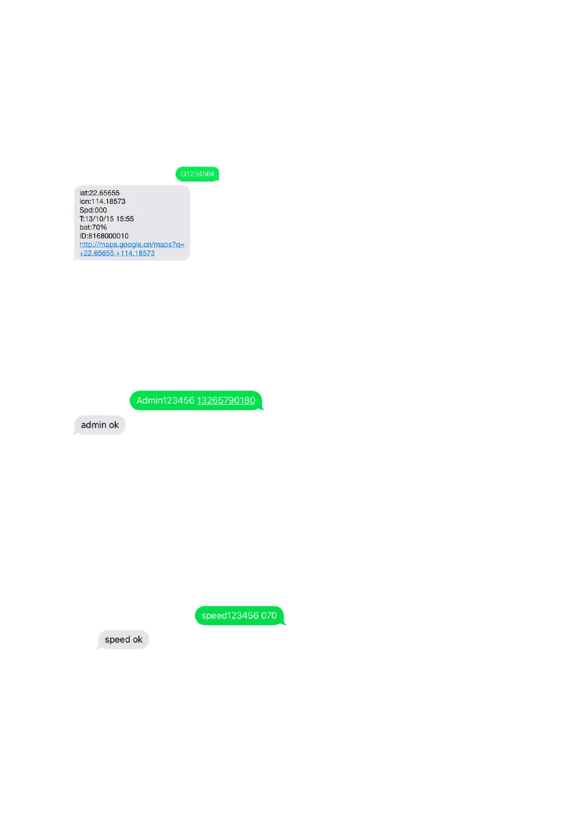 When the unit speed is over 70km/h, it will send message “speed alarm!” to the admin number every 5