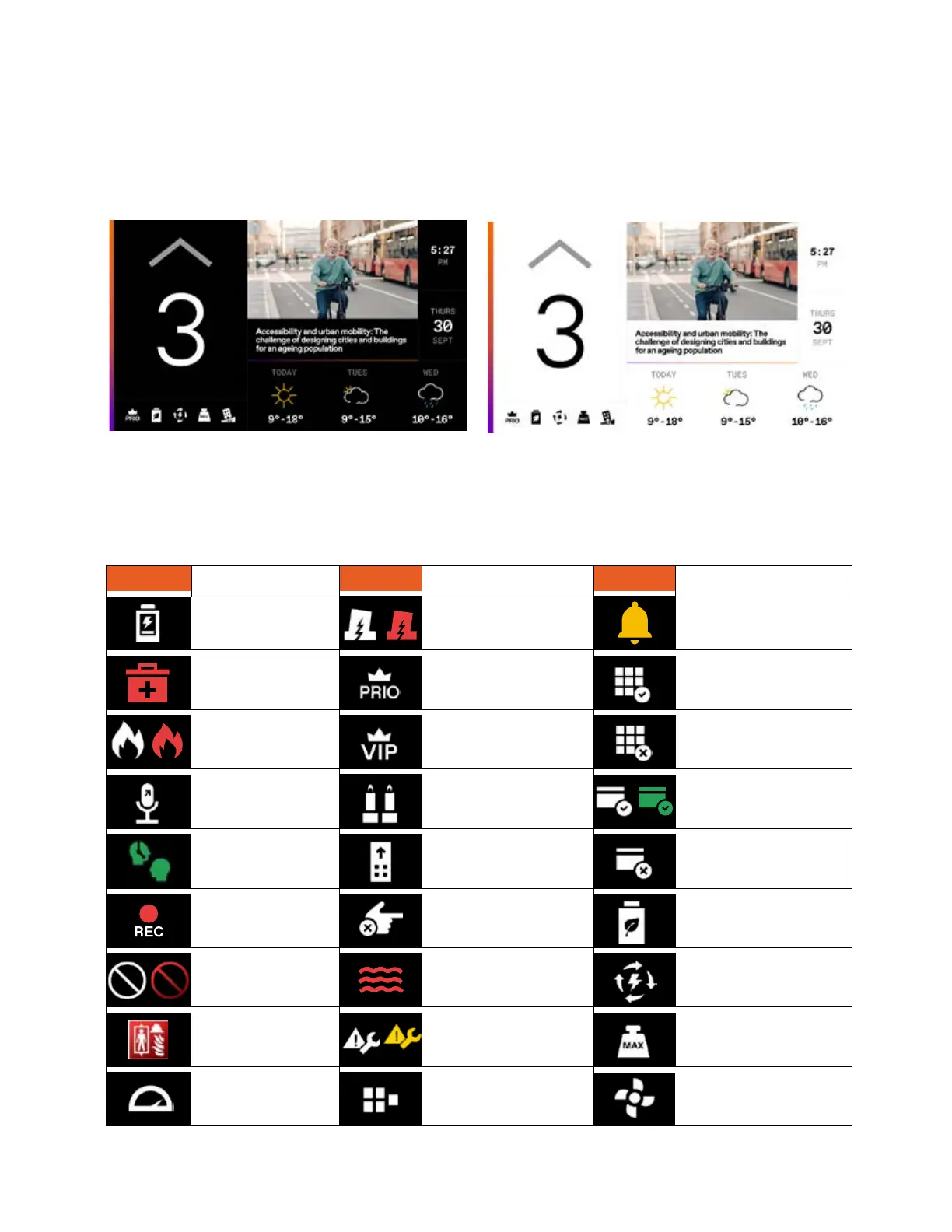 Icons may appear based on the controller information or the current status or configuration of the elevator system.