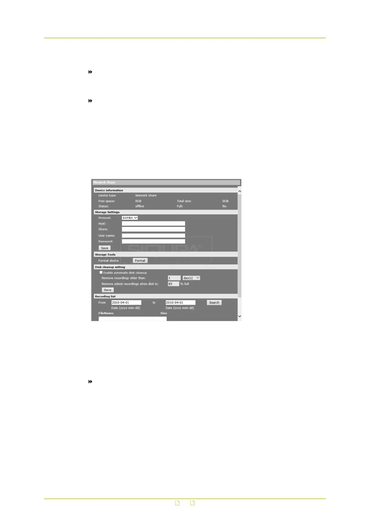 the recording files that are saved on the network share. Administrators can also format the