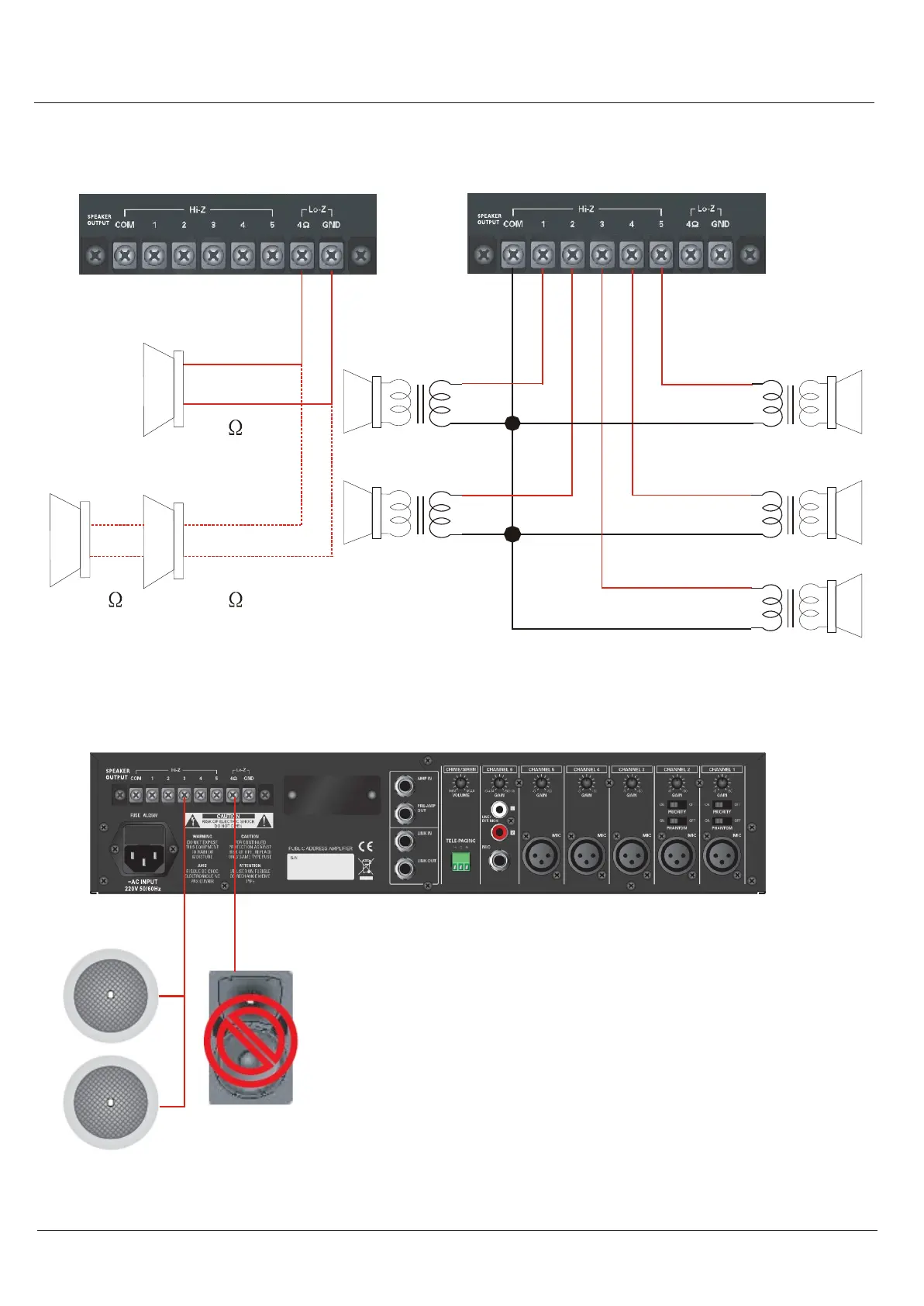 CAUTION : Never use both the Low-Z(4 ohms)and Hi-Z(25V, 70V and 100V) terminals at the
