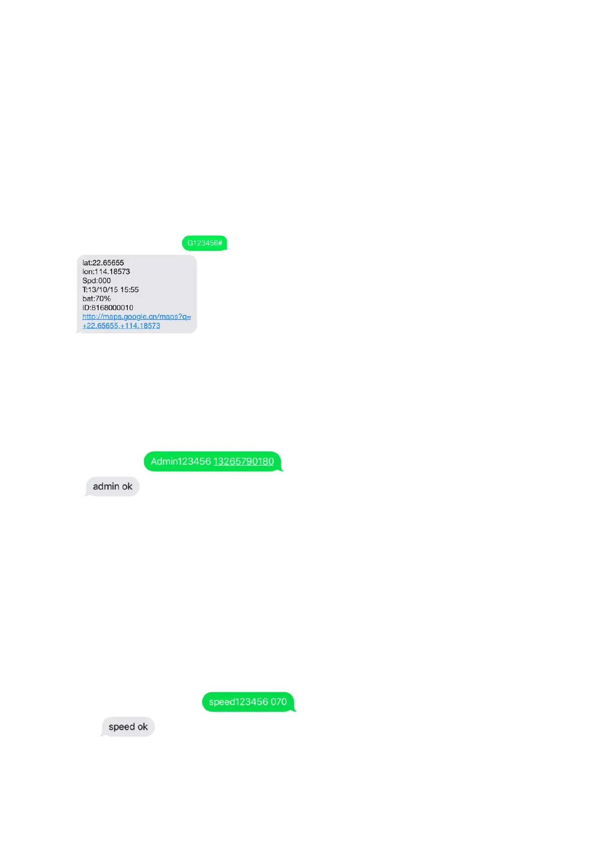 When the unit speed is over 70km/h, it will send message “speed alarm!” to the admin number every 5