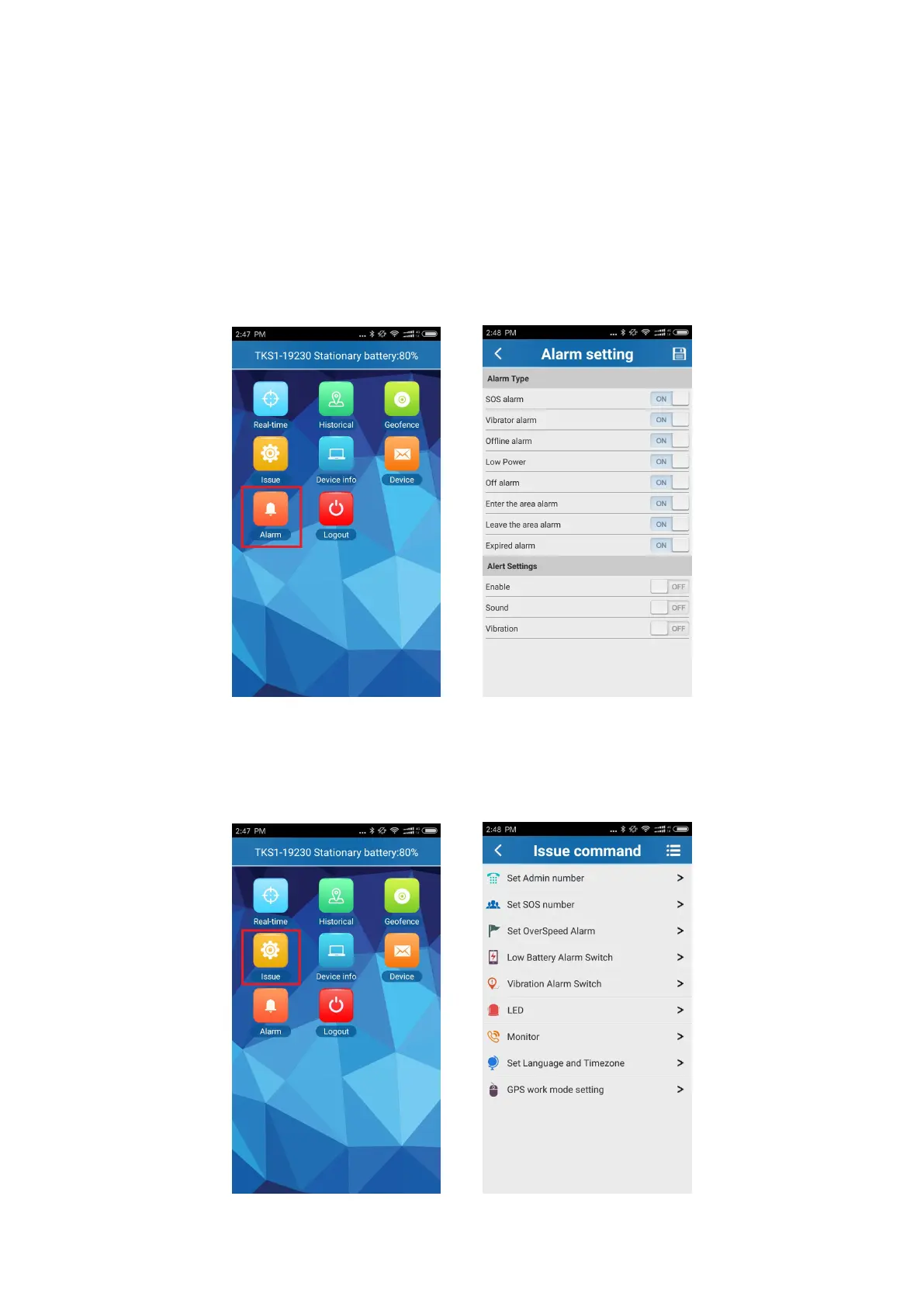 the area alarm(Geo-fence) and expired alarm. User can switch on and off, the alarm method can also can be