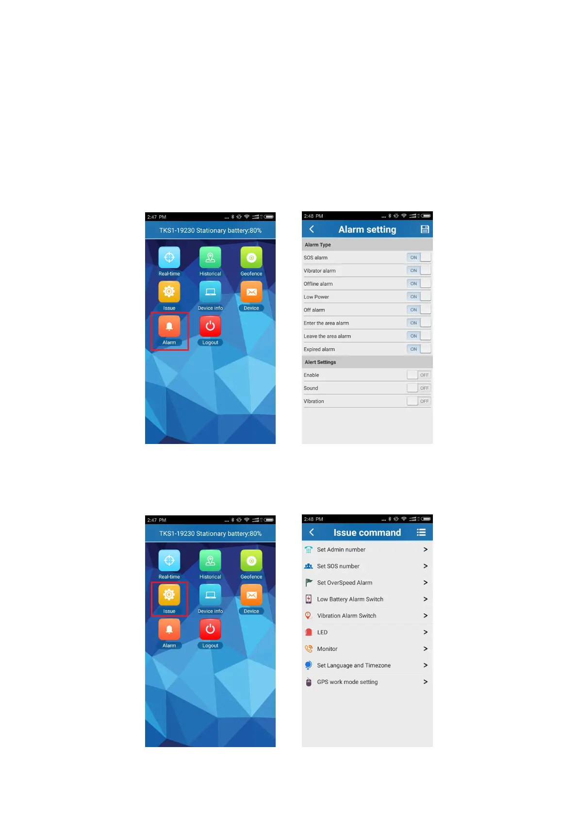 Alarme sind: der SOS-Alarm, die Vibration, der Offline-Alarm, die Leer-Batterie-Alarm, der Eintritt in oder der