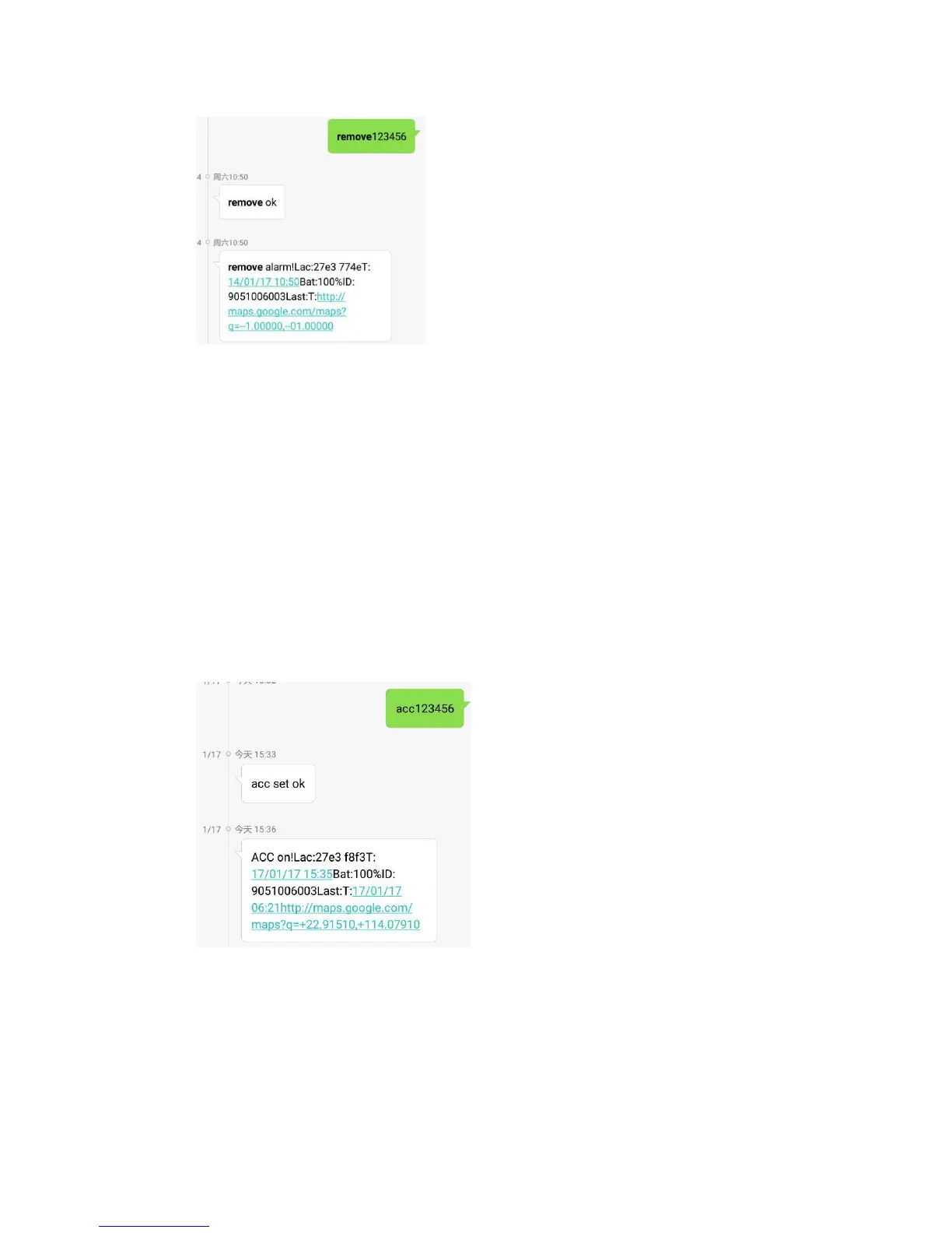 and starts, it will send “ACC on!” to admin number and SOS number by SMS.