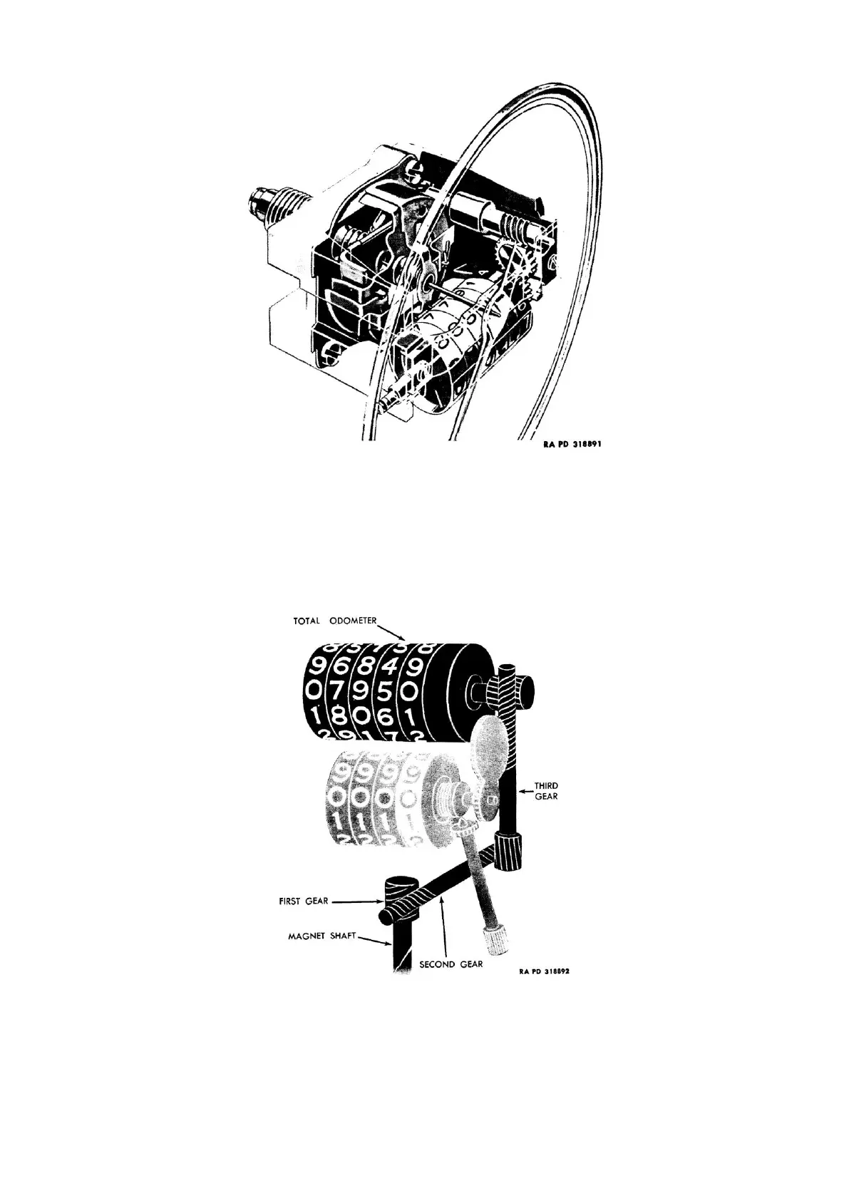a) Total odometer (fig. 7): The total odometer is driven through a series of gears originating at a spiral