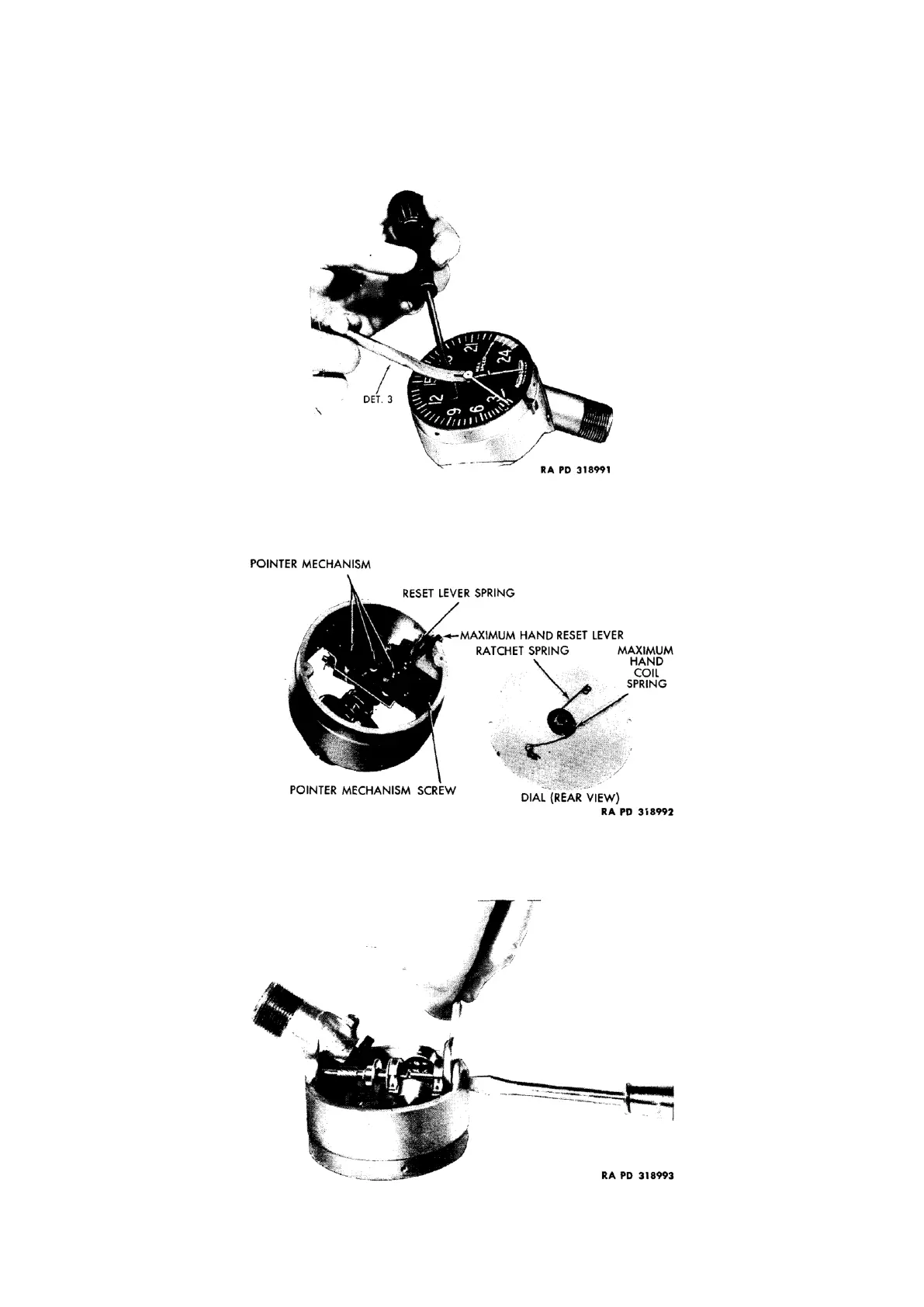 c. Remove pointer mechanism: Remove maximum hand reset lever spring (fig. 107). Remove two screws (fig.
