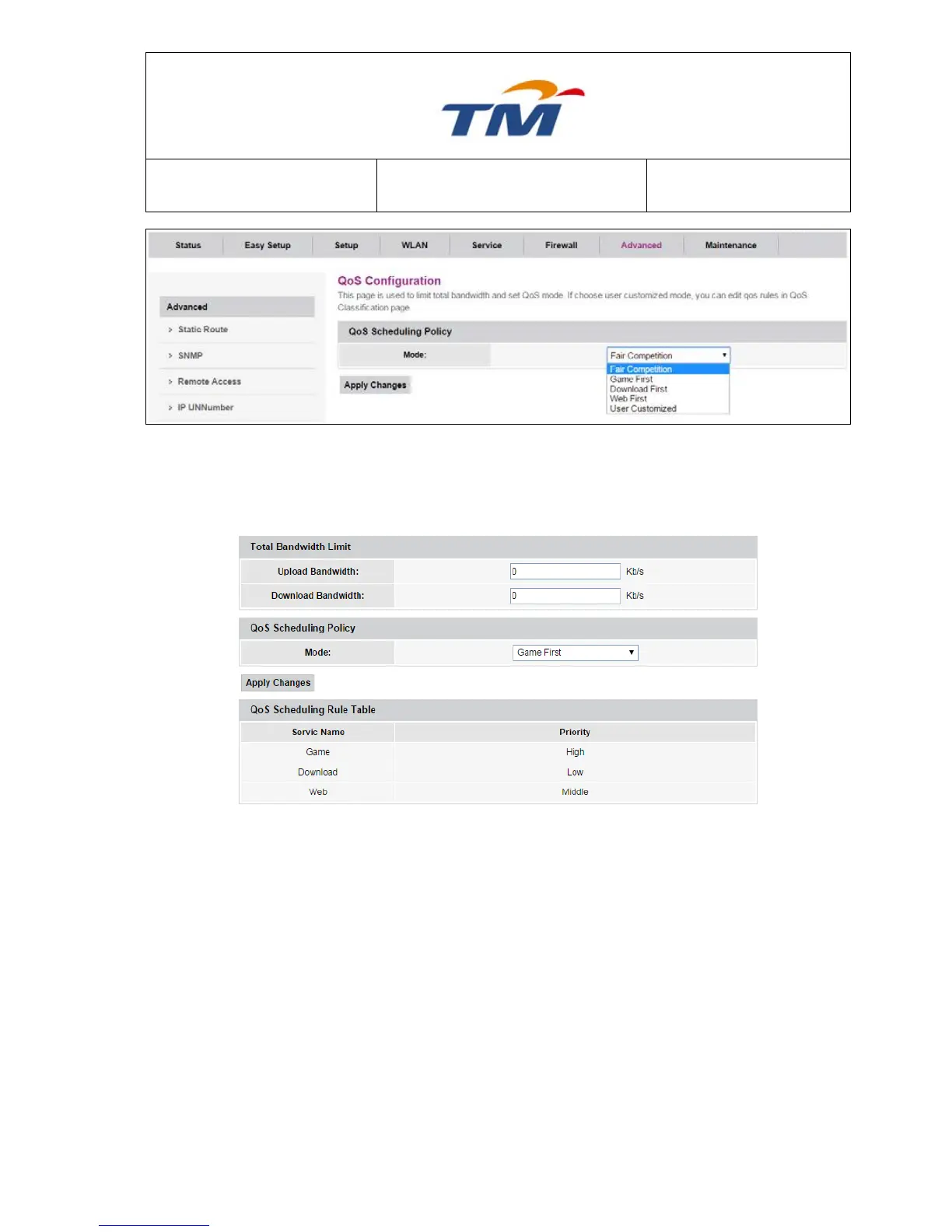 service is high, the priority of download is low and the priority of web access is middle in the QoS