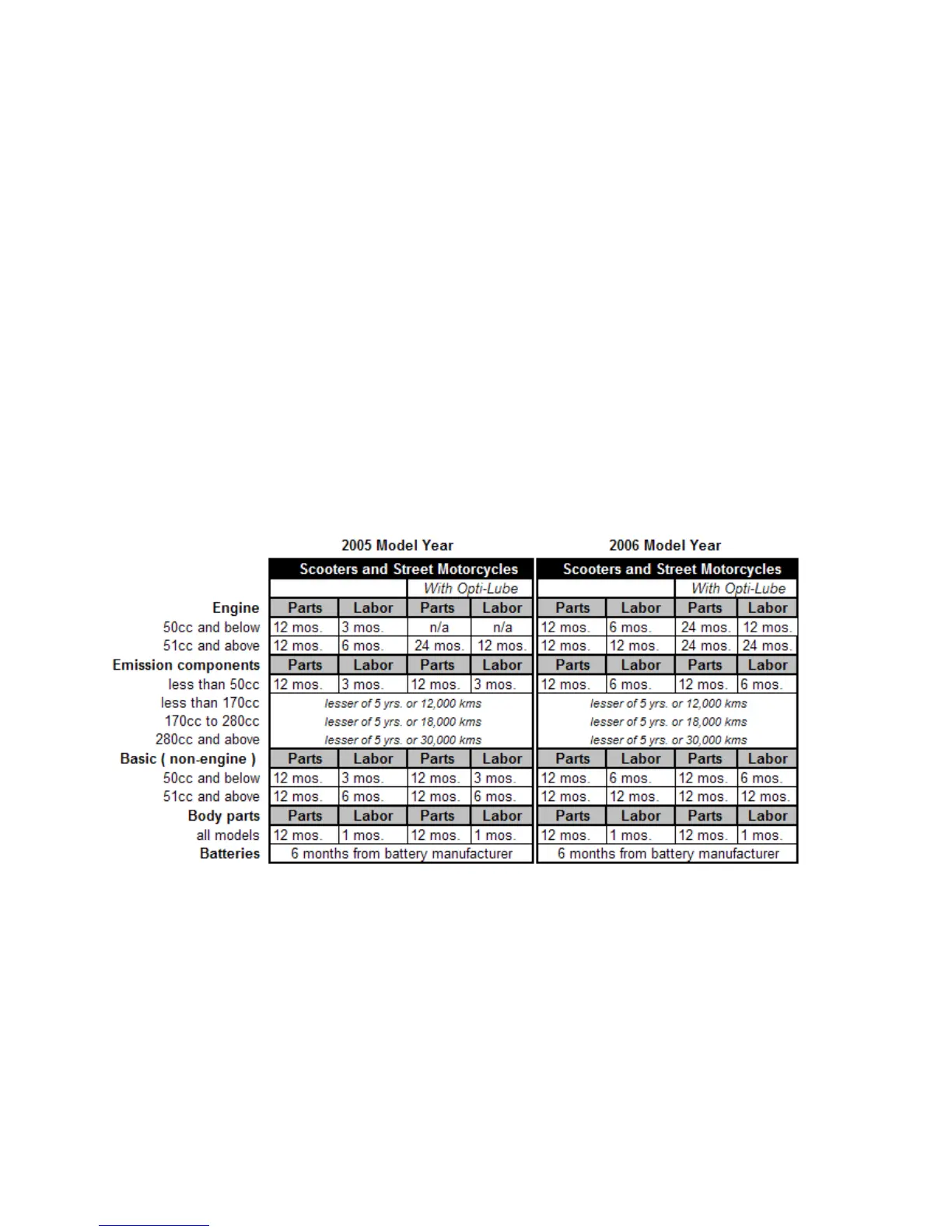 Warranty Coverage Table