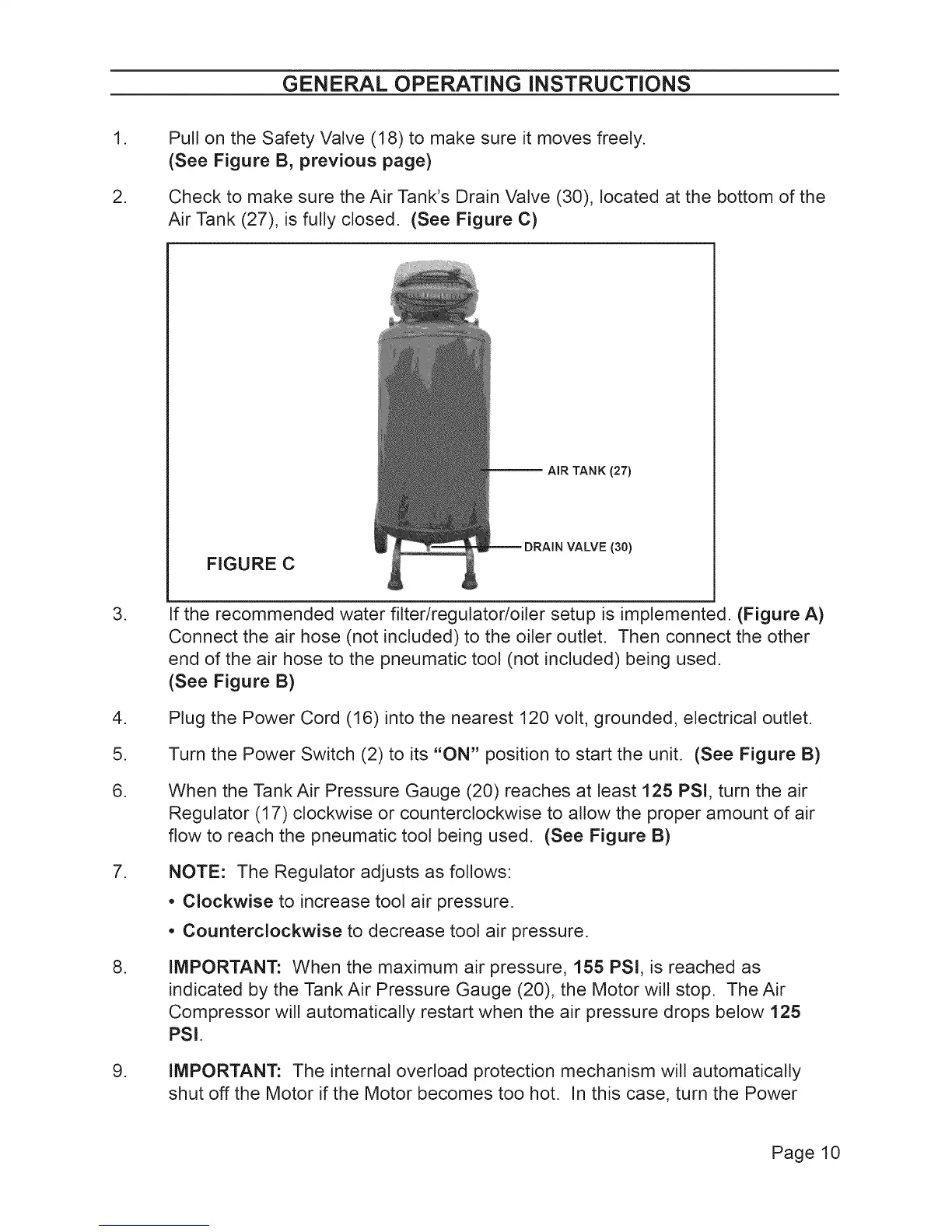 indicated by the Tank Air Pressure Gauge (20), the Motor will stop. The Air