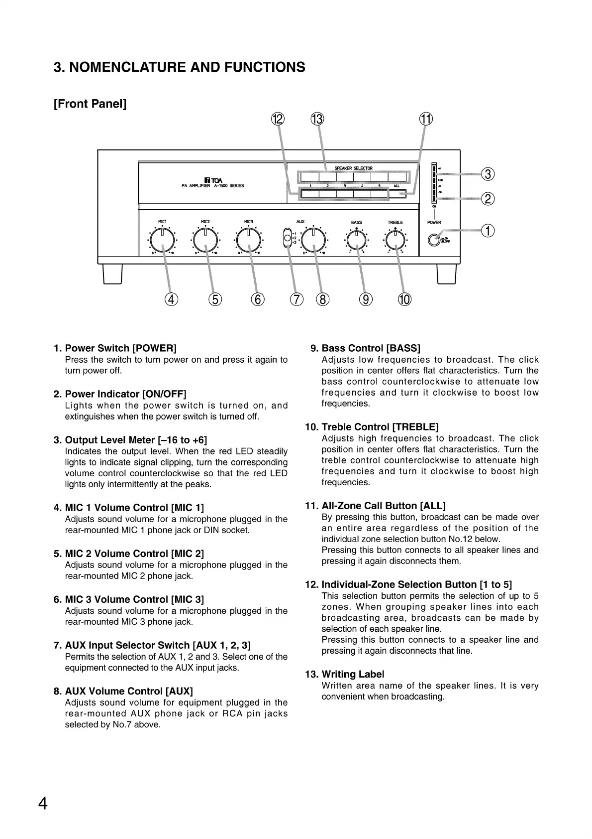 Toa A-1512 - NOMENCLATURE AND FUNCTIONS; Front Panel Controls