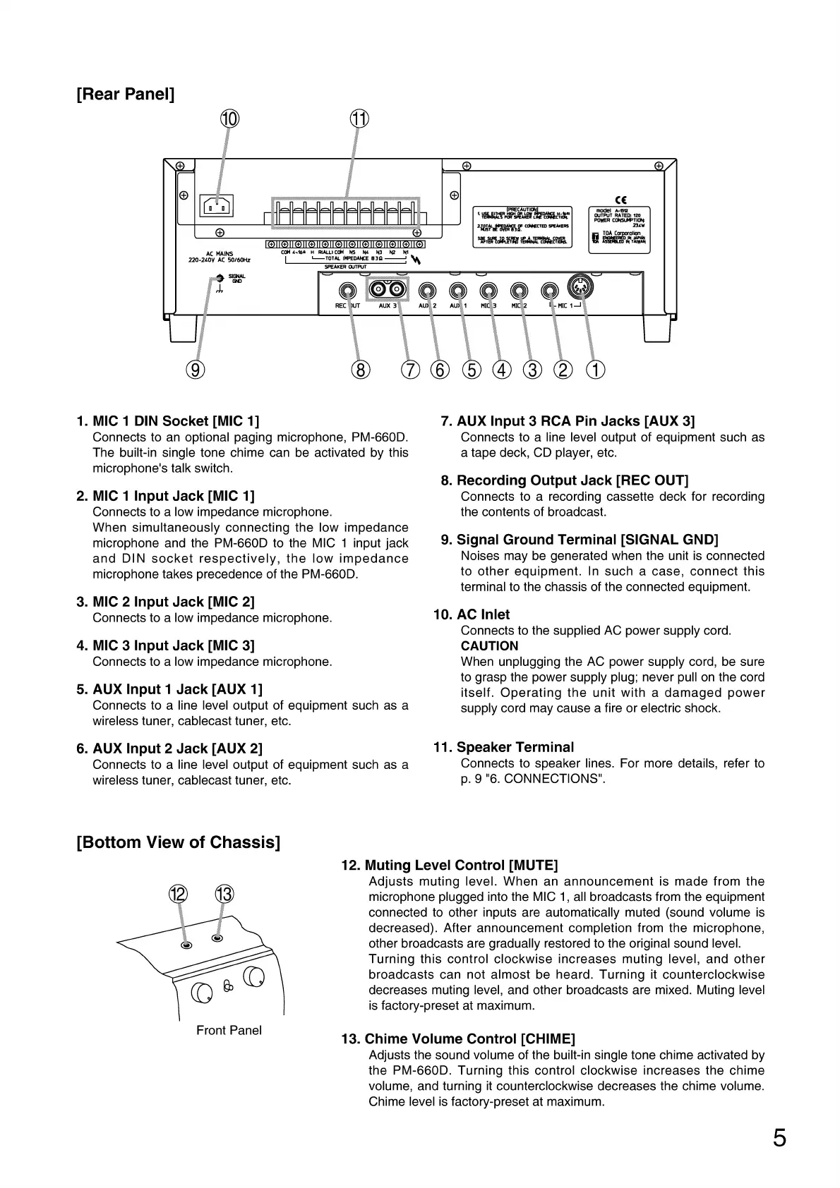 Toa A-1512 - Rear Panel Inputs and Outputs; Bottom View Controls