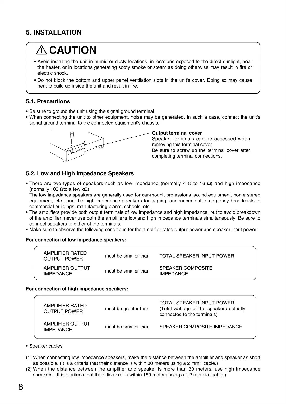 Toa A-1512 - INSTALLATION; Installation Precautions; Speaker Connection Guidelines