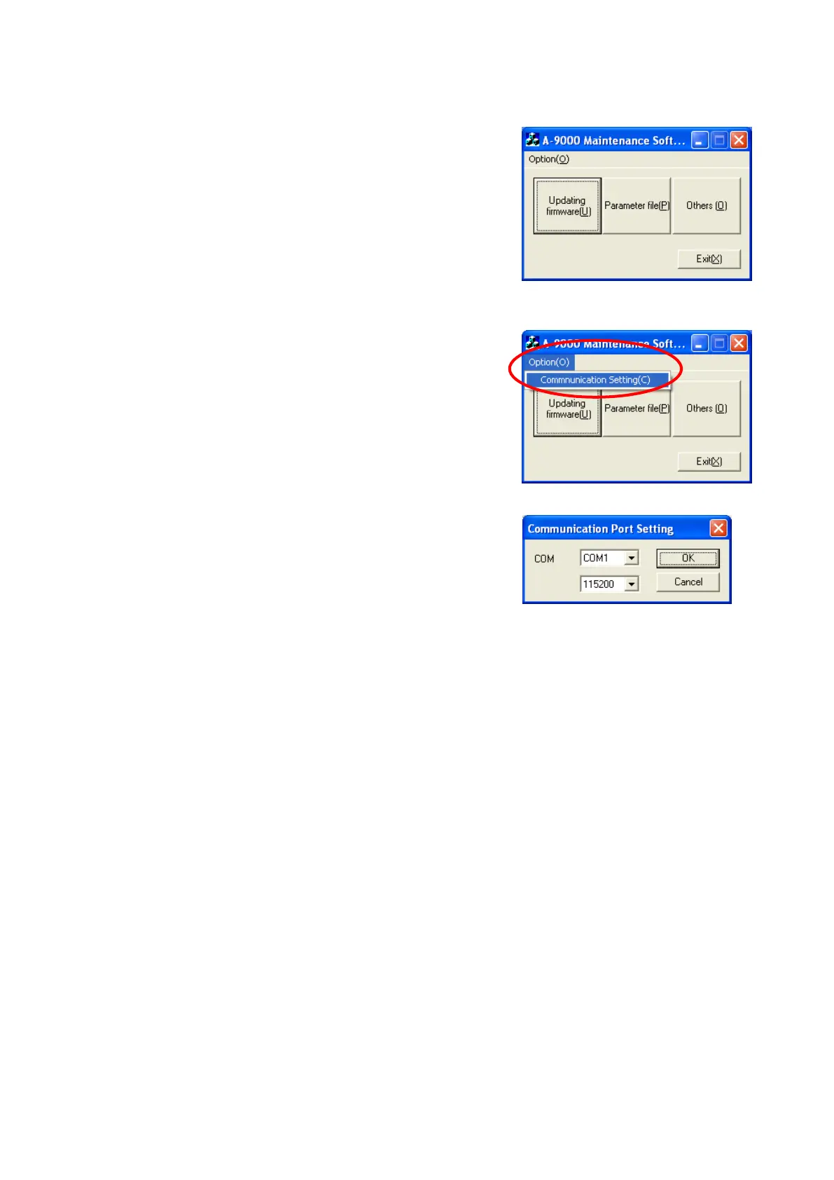 The COM port is factory-preset to "COM1" and the communication speed to "57600."