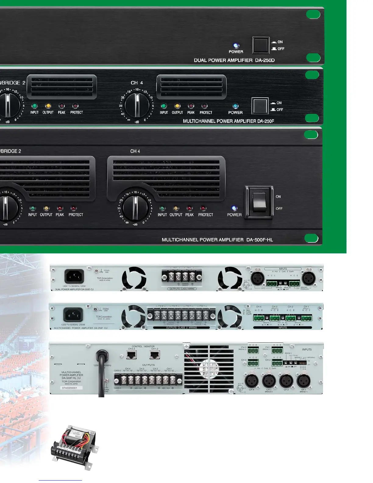 Secondary impedance: 100V line: 40Ω (250W), 70V line: 19.6Ω (250W), 50V line: 10Ω (250W),