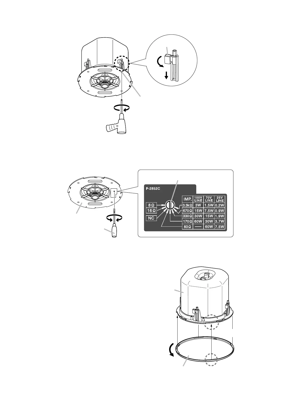 Never set this switch to low impedance (8 Ω or 16 Ω) when using a high impedance 25, 70, or 100 V