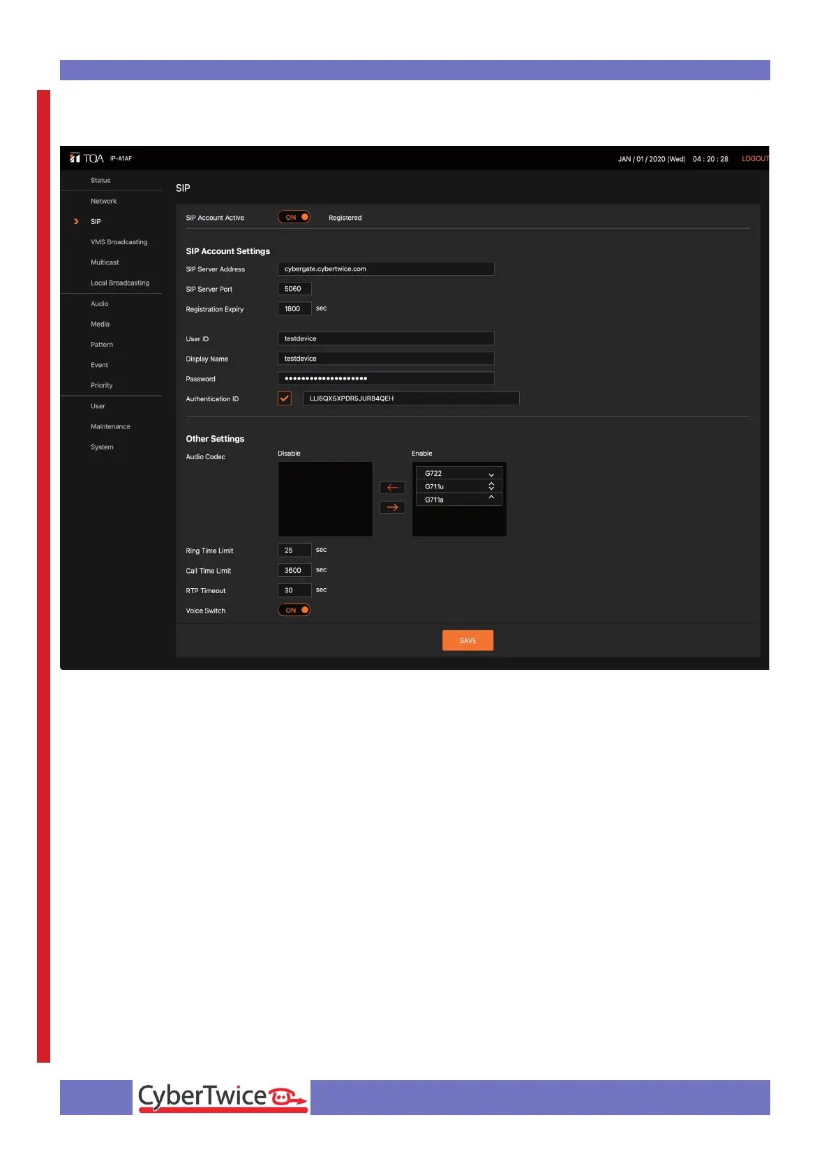 Congure TOA IP Audio Systems for the CyberGate serviceCyberTwice