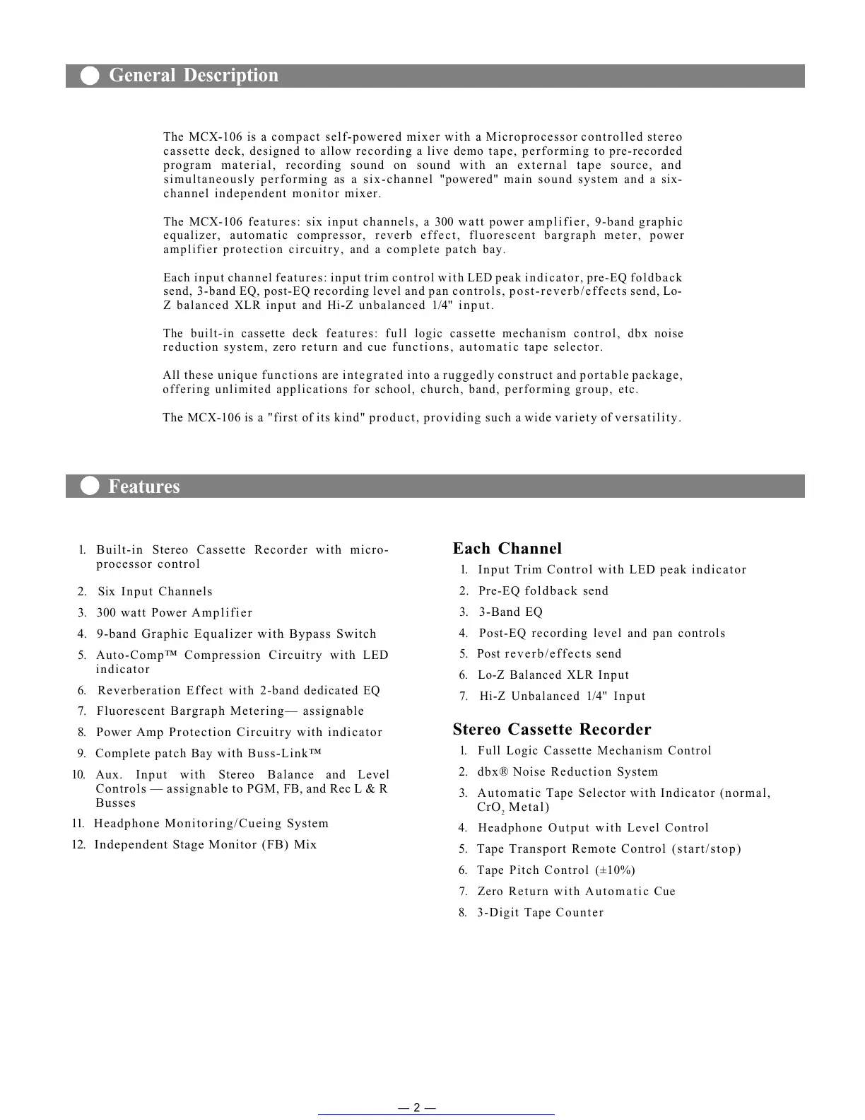 The MCX-106 is a compact self-powered mixer with a Microprocessor controlled stereo