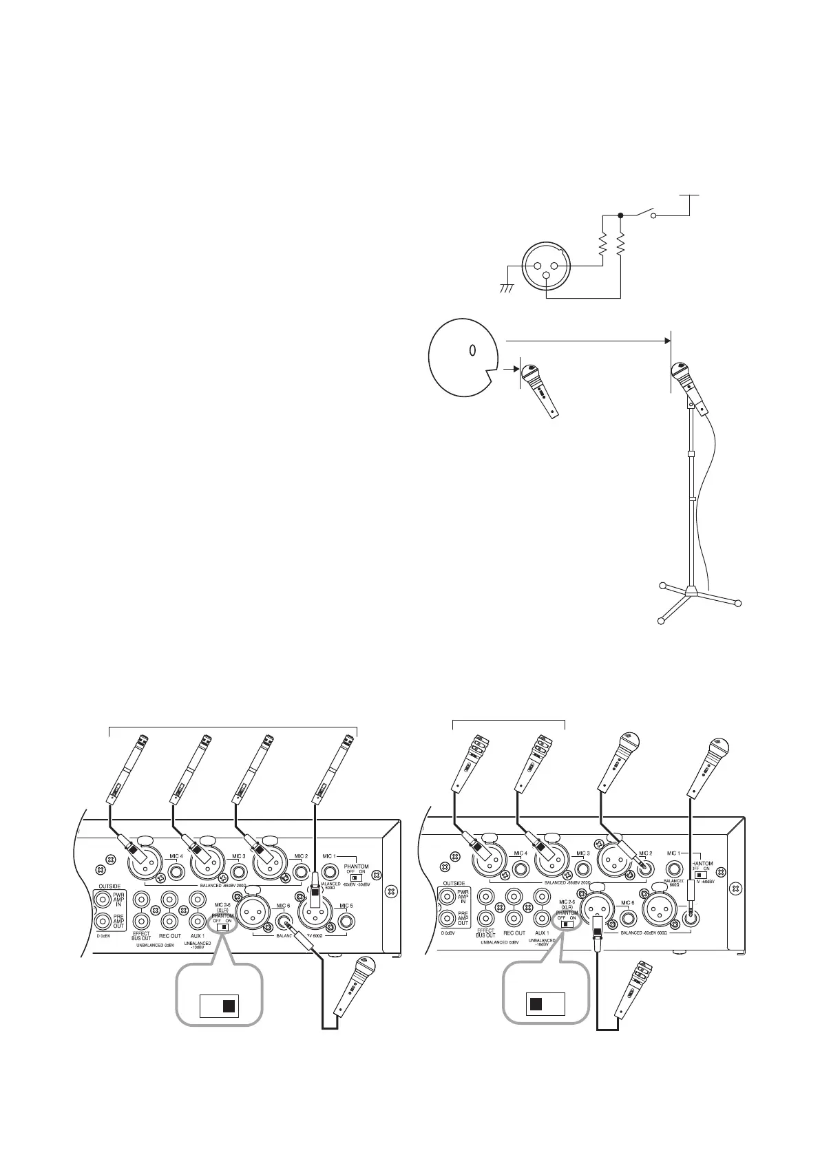 Microphones equipped with either an XLR connector or a phone plug can be used with microphone inputs 2 – 6.