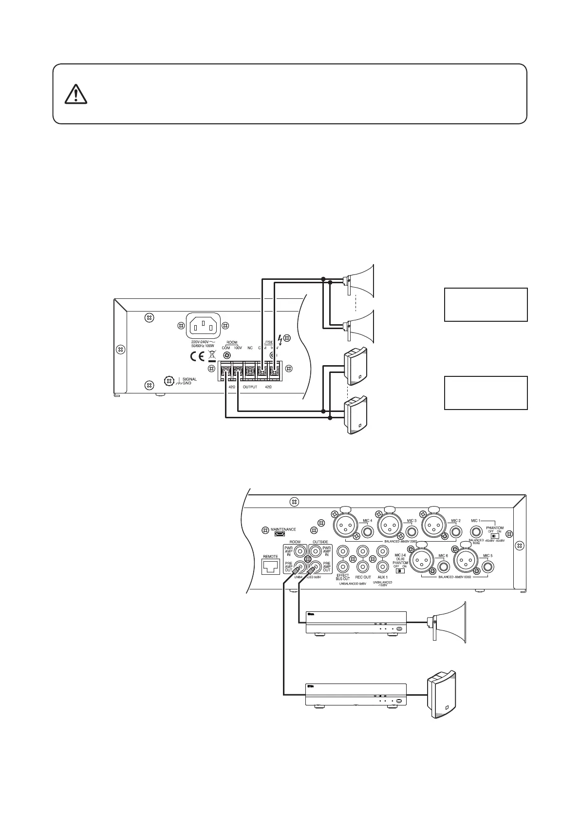 • Connect only high-impedance 100 V line speakers to the unit. Connection of low-impedance speakers could