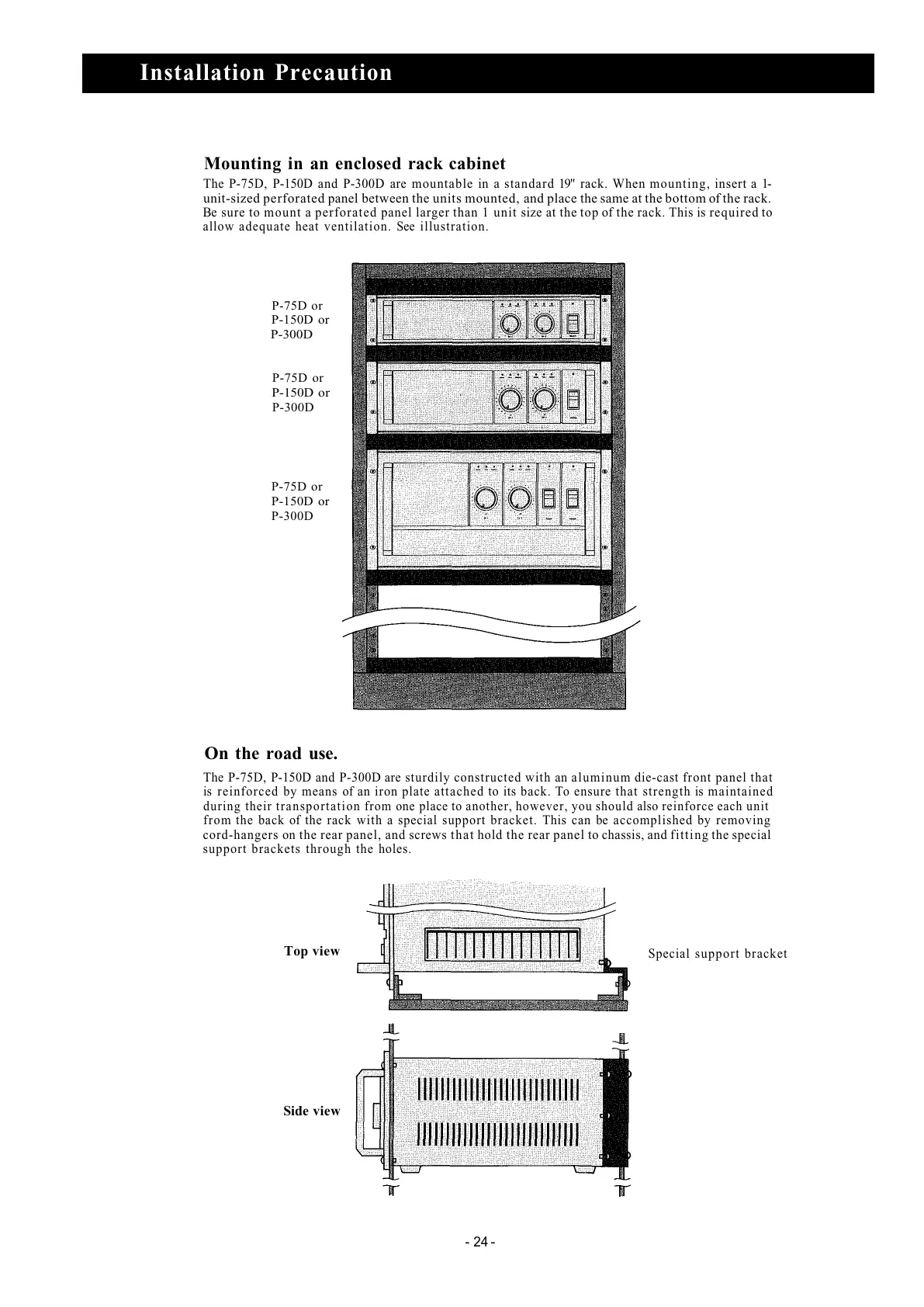 The P-75D, P-150D and P-300D are mountable in a standard 19" rack. When mounting, insert a 1-