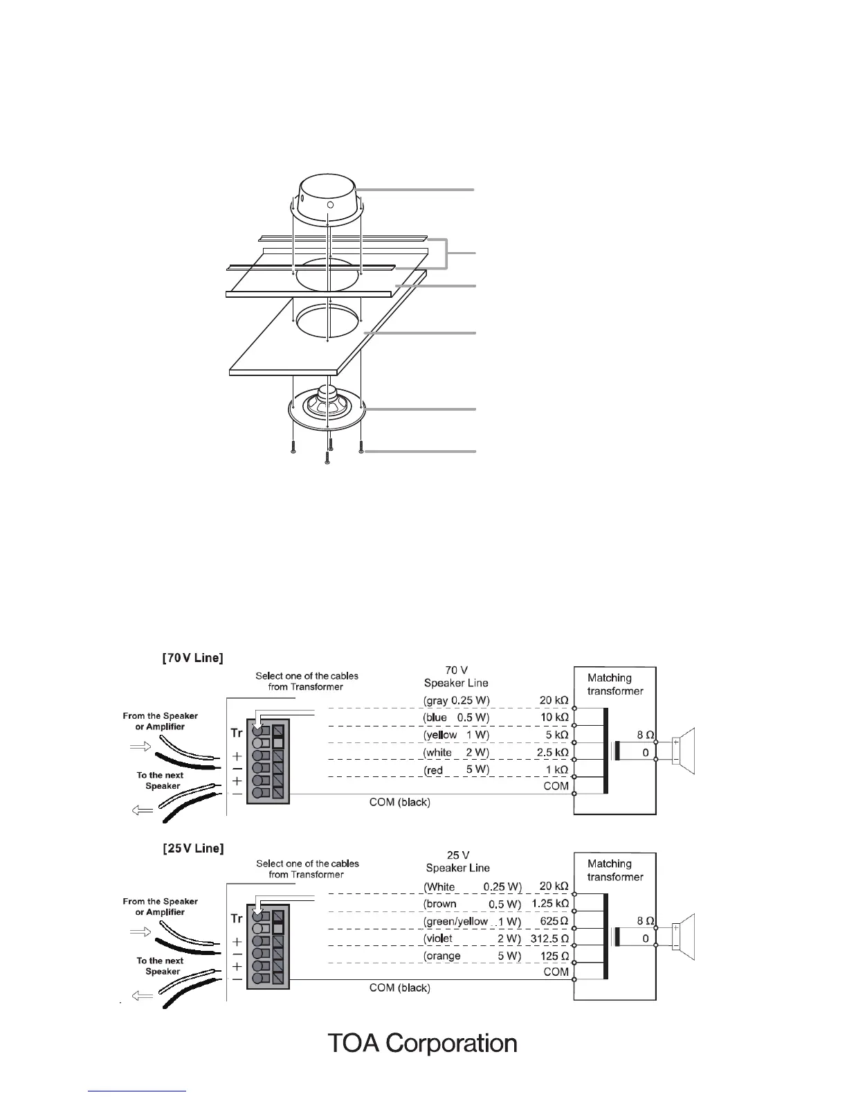 See the diagrams below for wire color and transformer tap selection (70 V line and 25 V line).