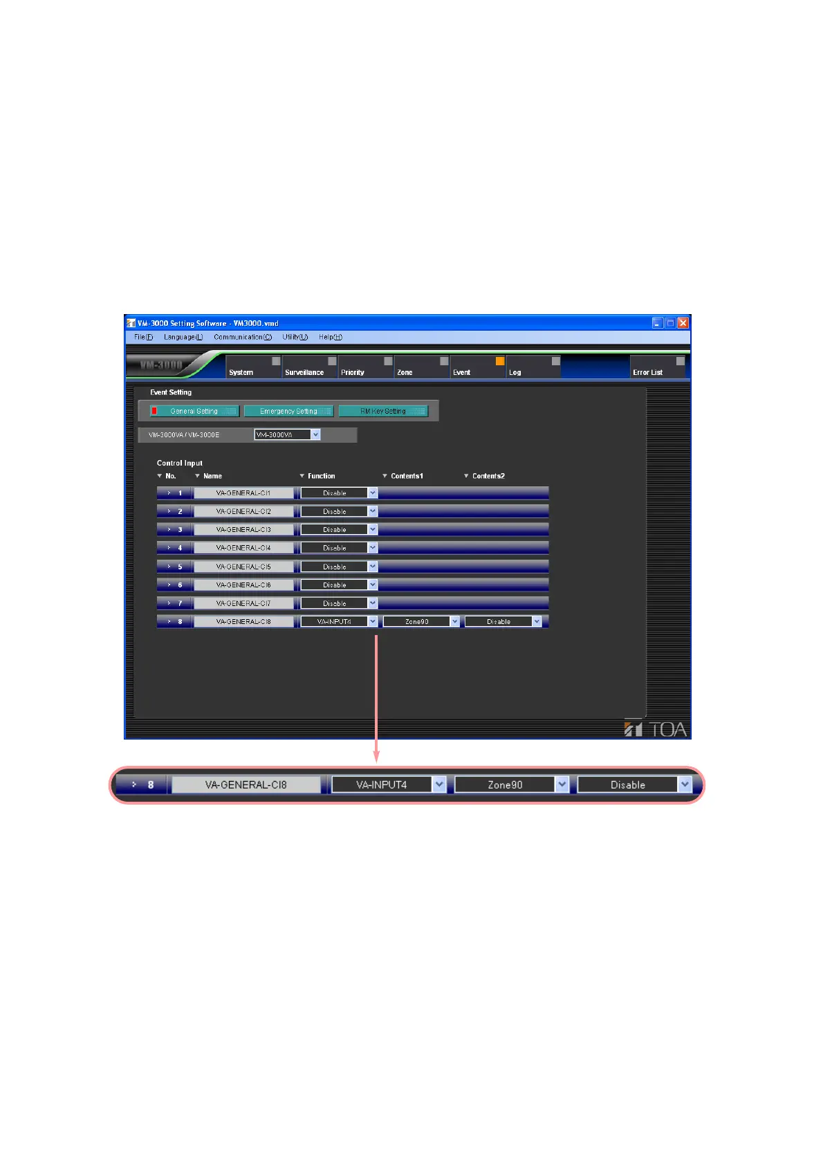 Step 2. Perform the general control input No. 8 setting on the VM-3000 Setting Software screen as shown