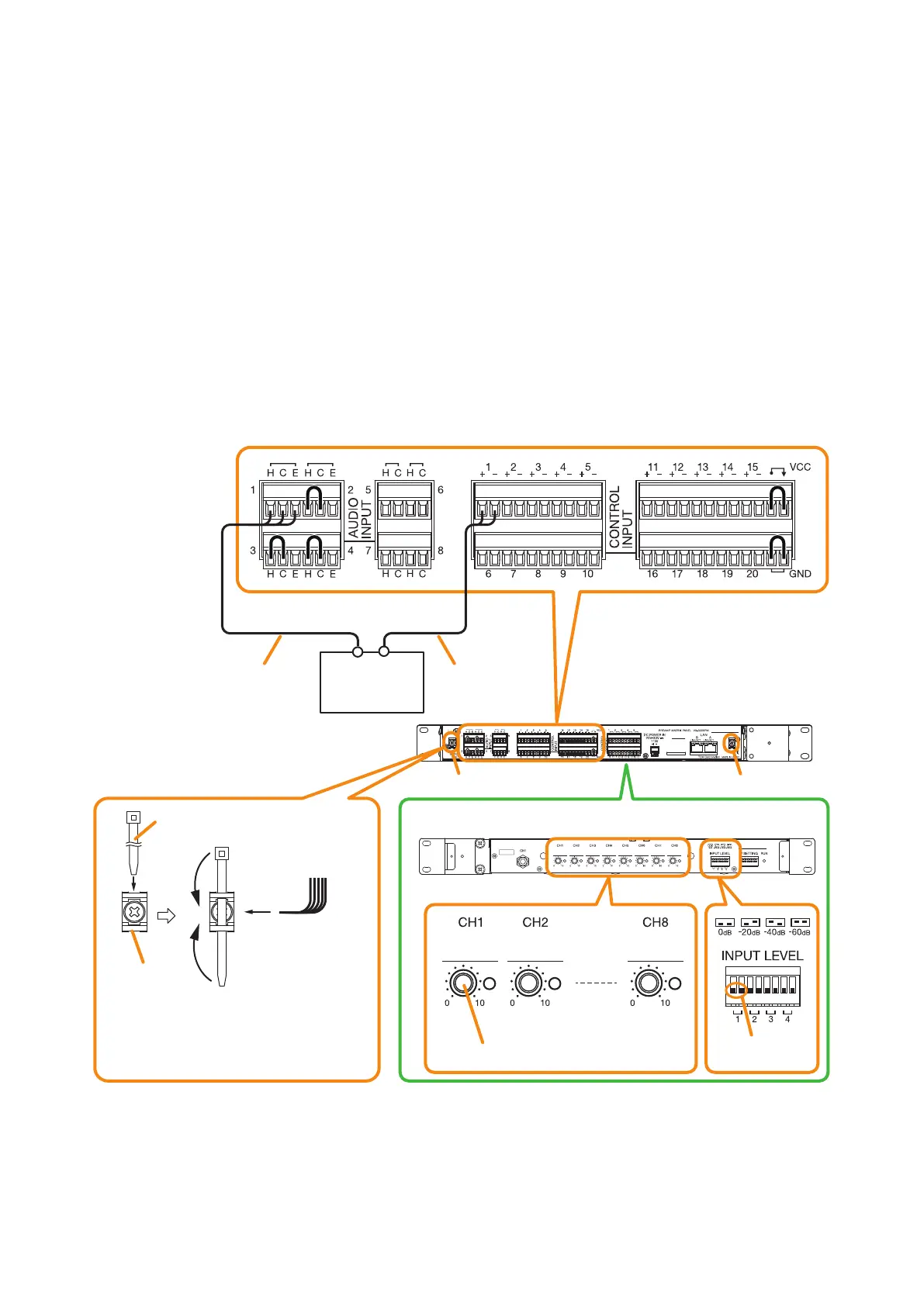 Eight Input channels (1 through 8) are provided for the audio inputs. Use 2-core shielded cables for connection
