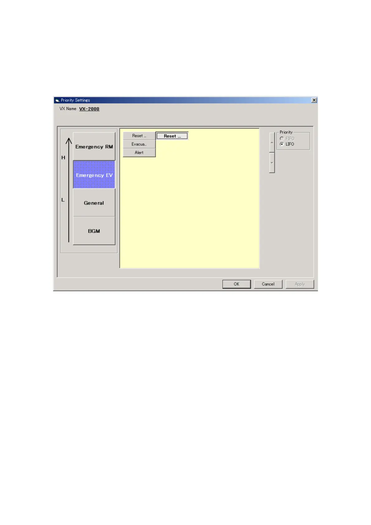 follows in order of highest to lowest priority: [Reset], [Evacuation], and [Alert].