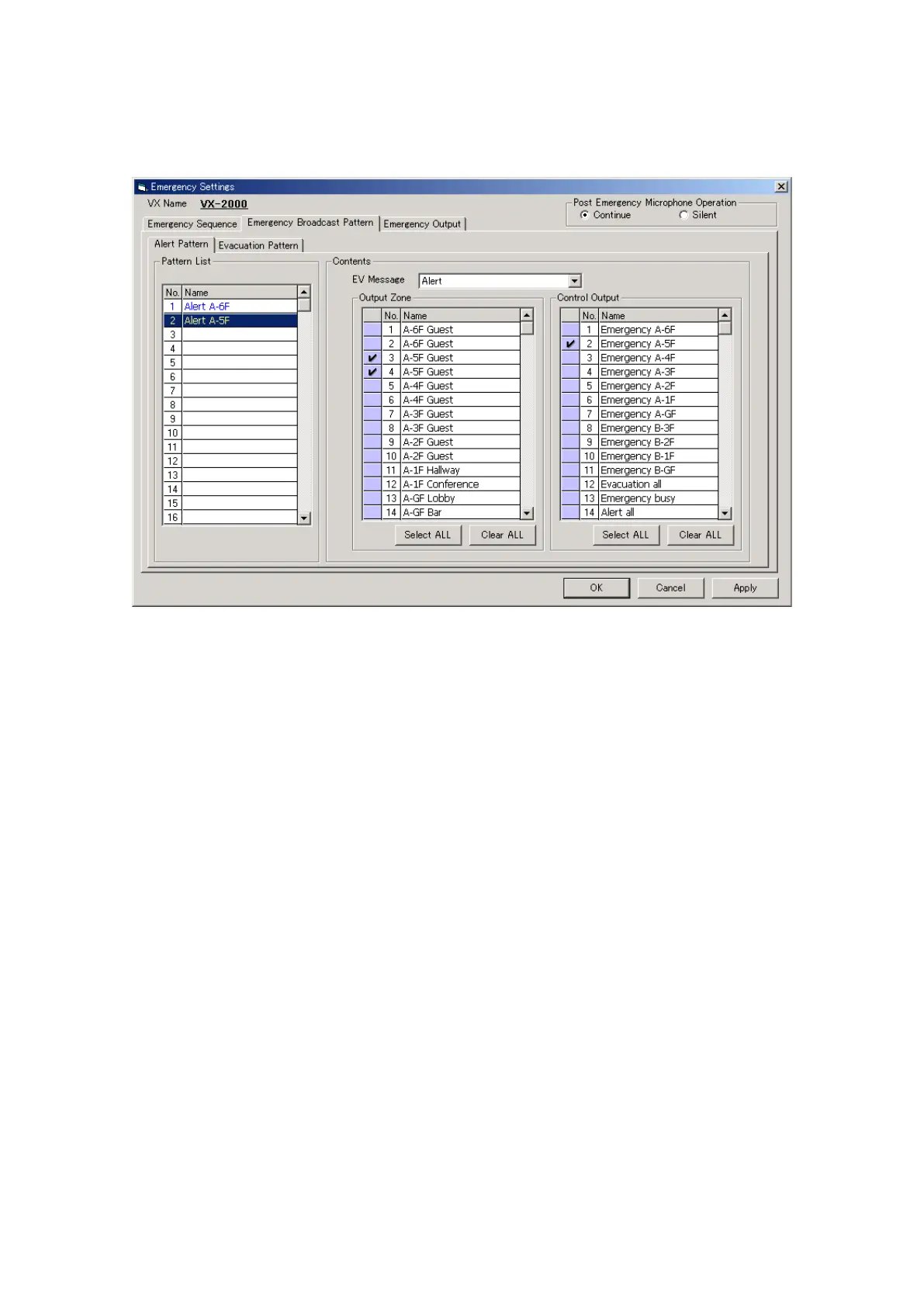 Here, up to 50 Alert patterns and 50 Evacuation patterns can be created.