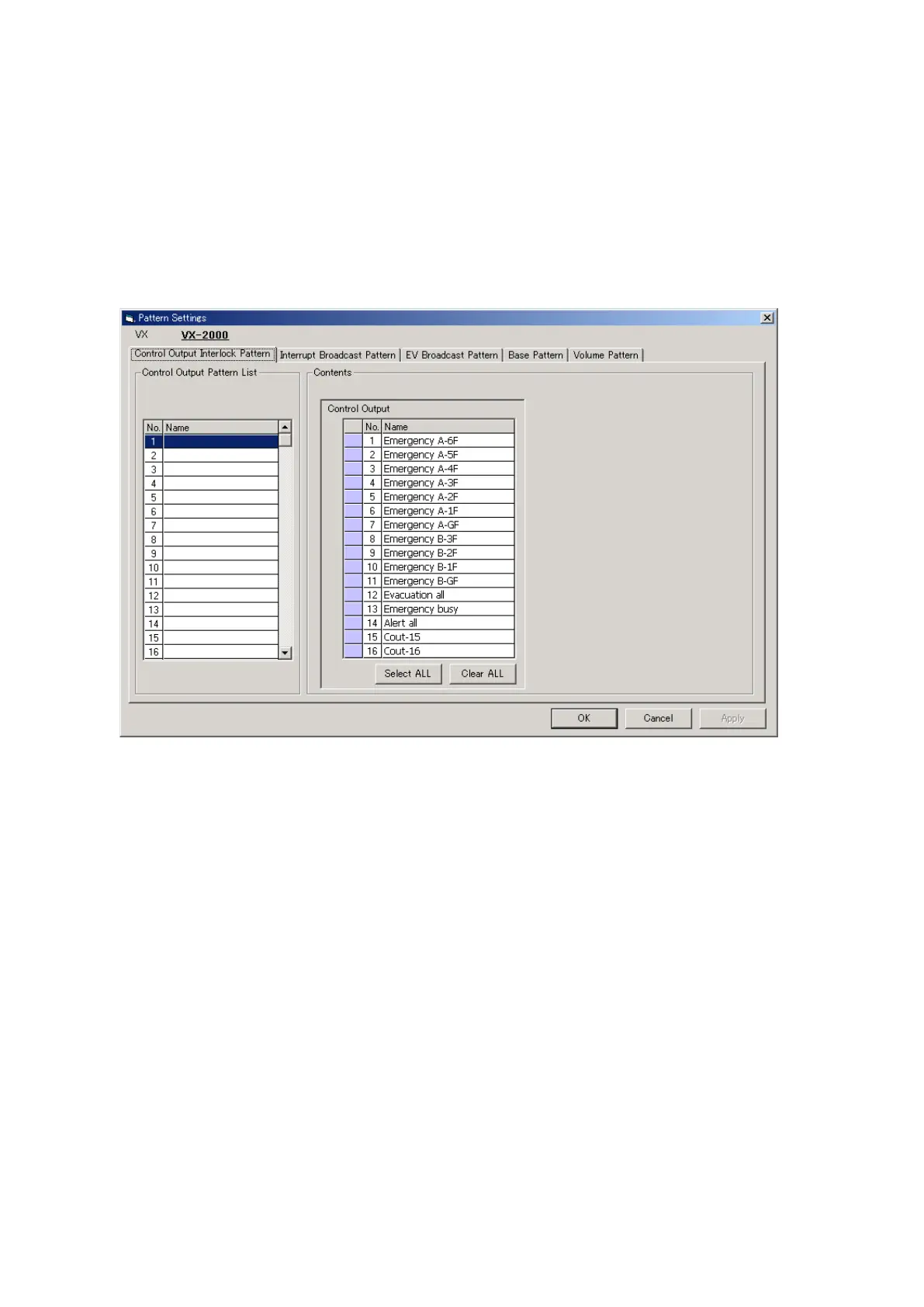Step 1. When the Pattern Settings window opens, the Control Output Interlock Patterns display will appear.