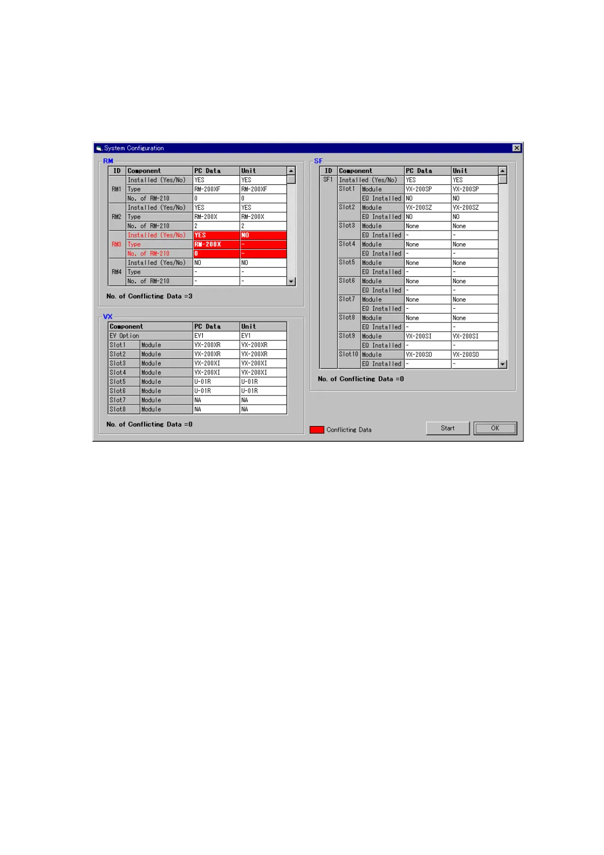 the system setting file and actual configuration are displayed in red (Conflicting Data).