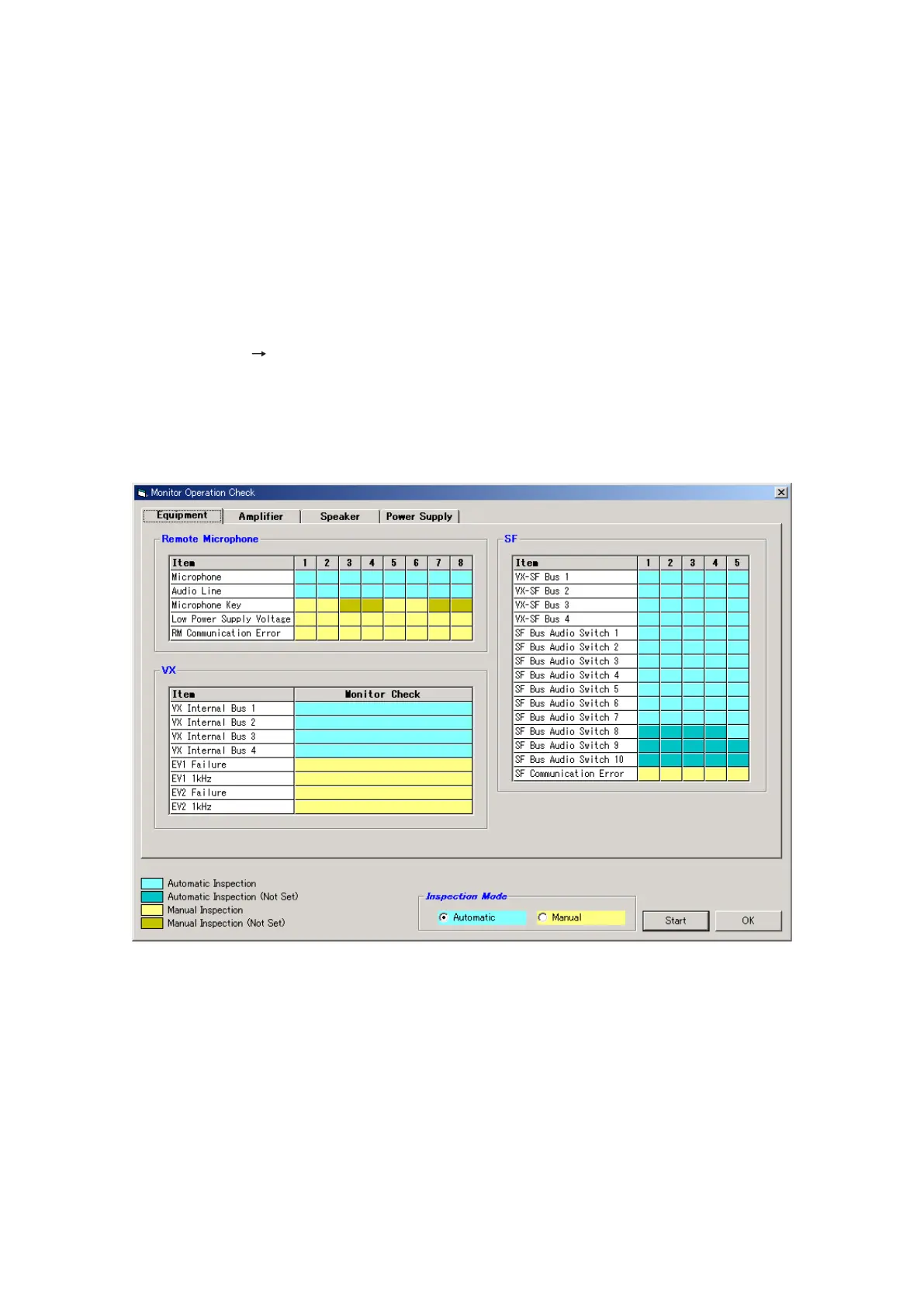 The inspection items are divided into 4 classifications of Equipment, Amplifier, Speaker, and Power