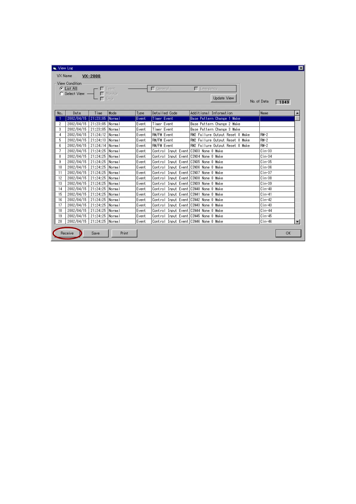Clicking on the [Receive] button permits communications to be started and the most recent log to be
