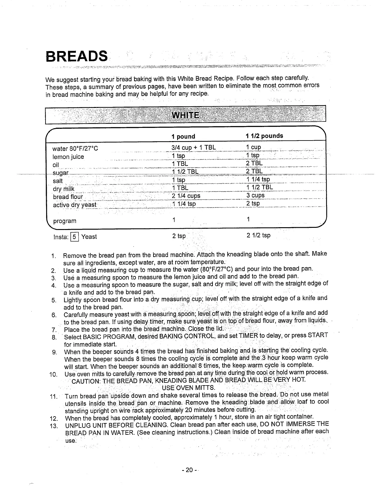 Toastmaster 1187S - Bread Recipes: White; White Bread - 1 Pound Recipe; White Bread - 1 1;2 Pounds Recipe