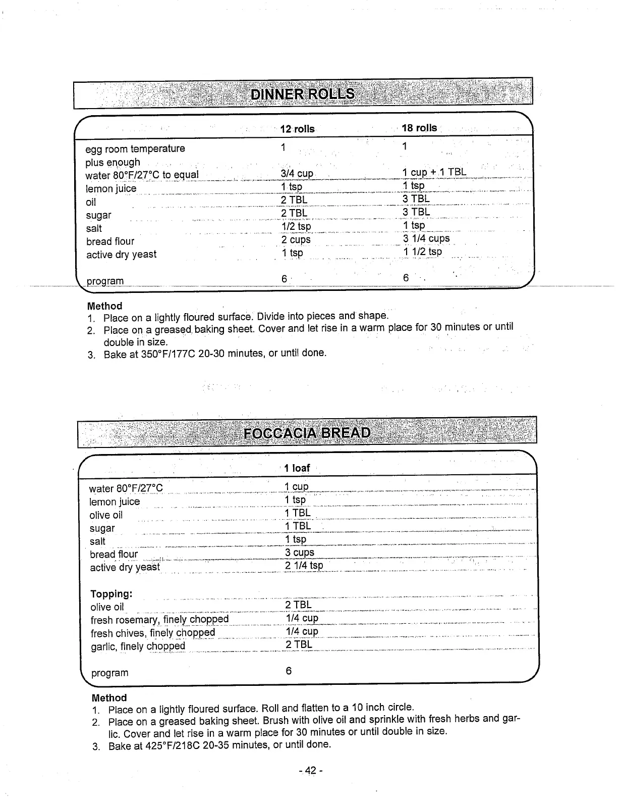 Toastmaster 1187S - Dough Recipes: Dinner Rolls & Focaccia Bread; Dinner Rolls Recipe; Focaccia Bread Recipe