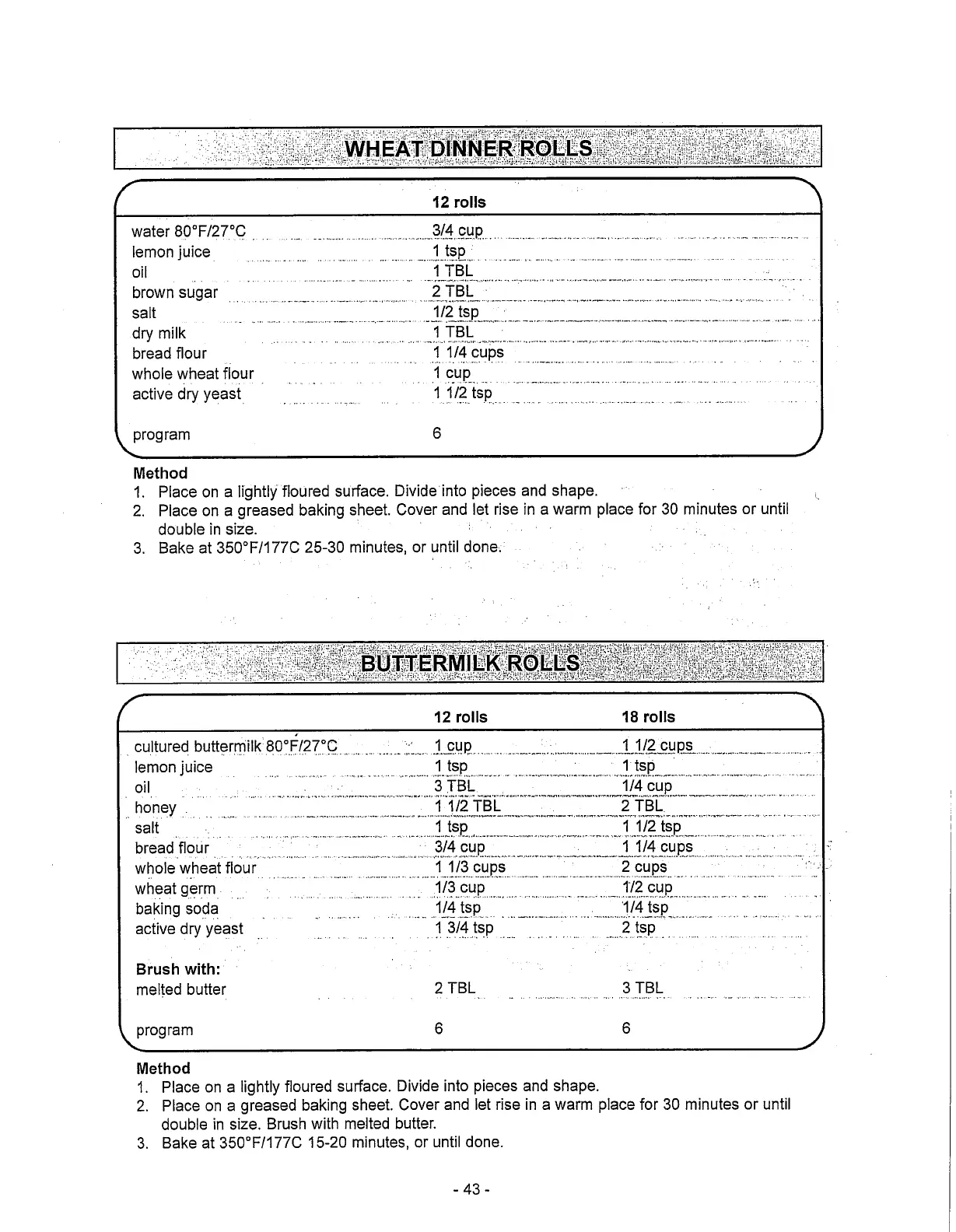 Toastmaster 1187S - Dough Recipes: Wheat Dinner Rolls & Buttermilk Rolls; Wheat Dinner Rolls Recipe; Buttermilk Rolls Recipe