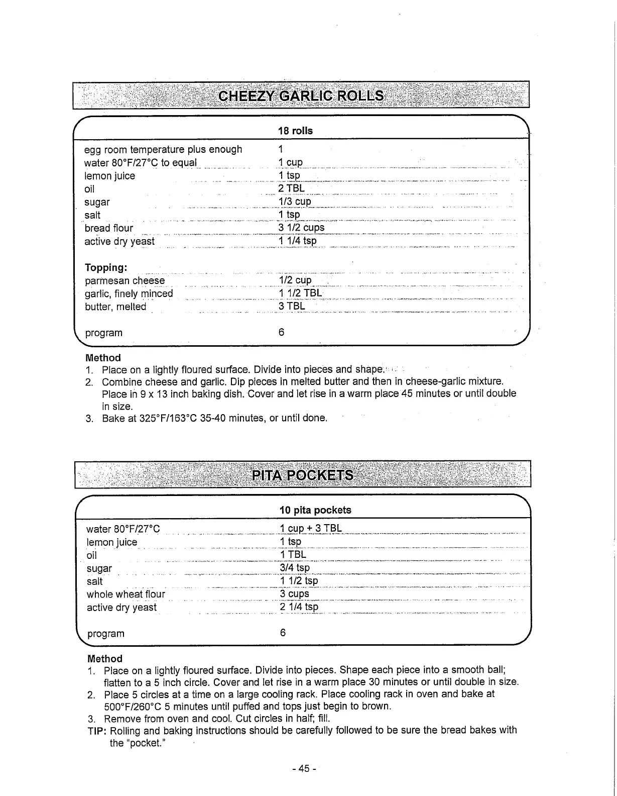 Toastmaster 1187S - Dough Recipes: Cheezy Garlic Rolls & Pita Pockets; Cheezy Garlic Rolls Recipe; Pita Pockets Recipe