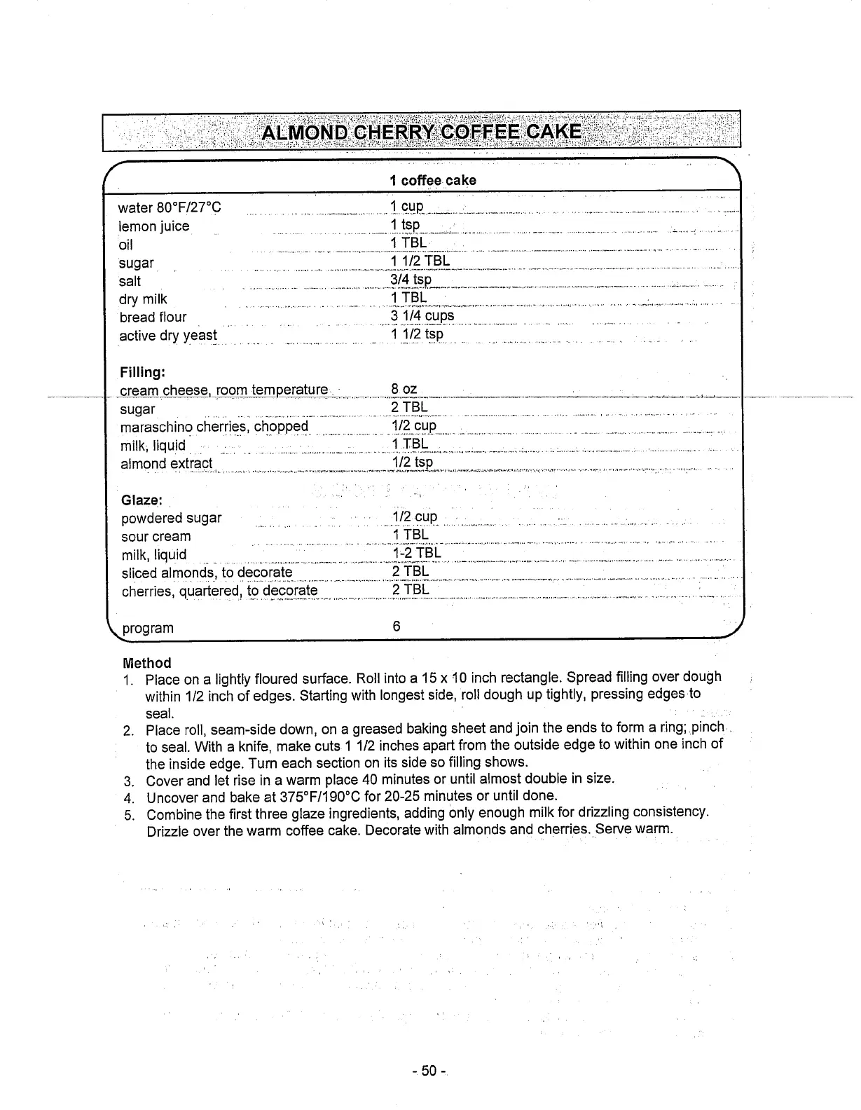 Toastmaster 1187S - Dough Recipe: Almond Cherry Coffee Cake; Almond Cherry Coffee Cake Preparation