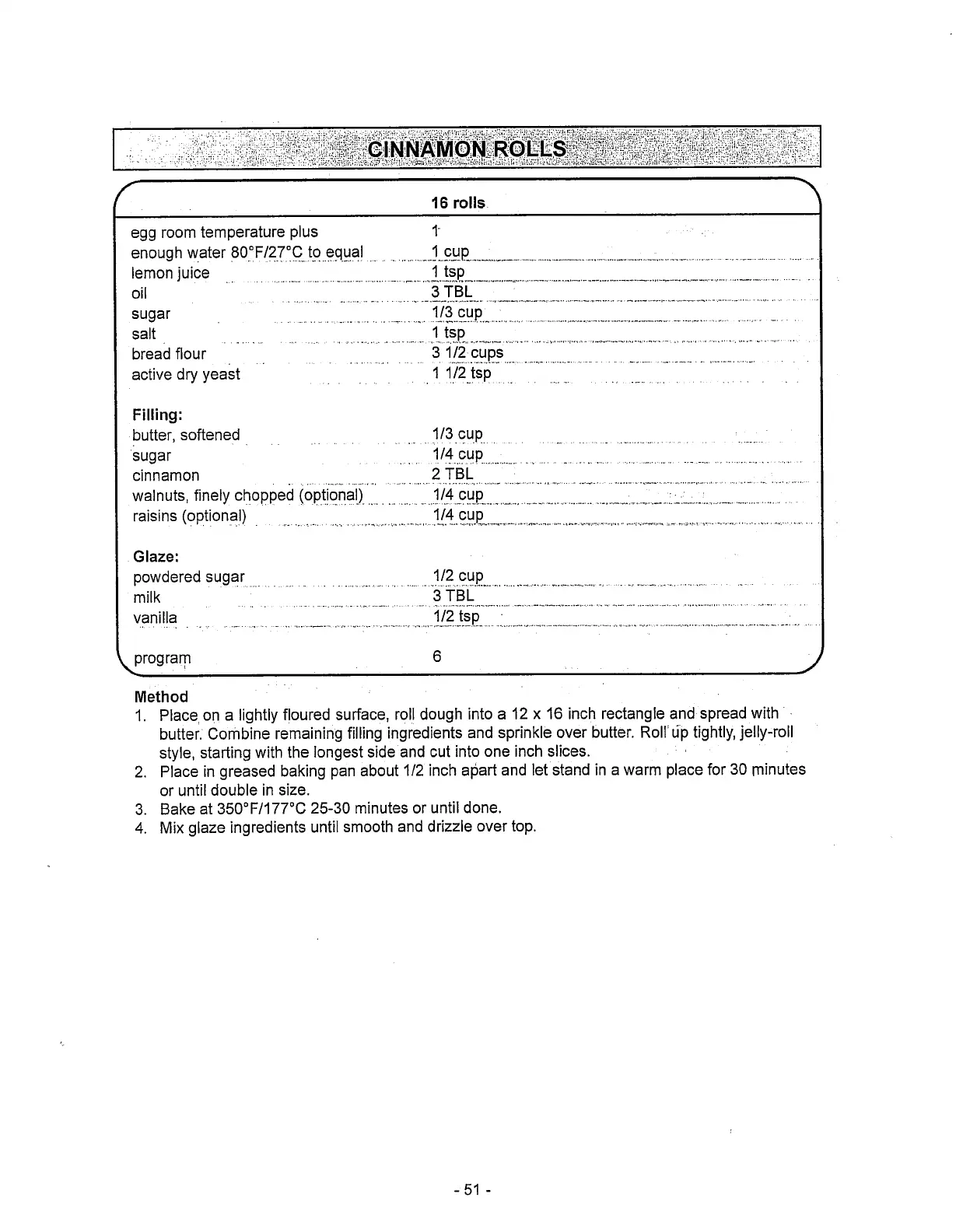 Toastmaster 1187S - Dough Recipe: Cinnamon Rolls; Cinnamon Rolls Preparation