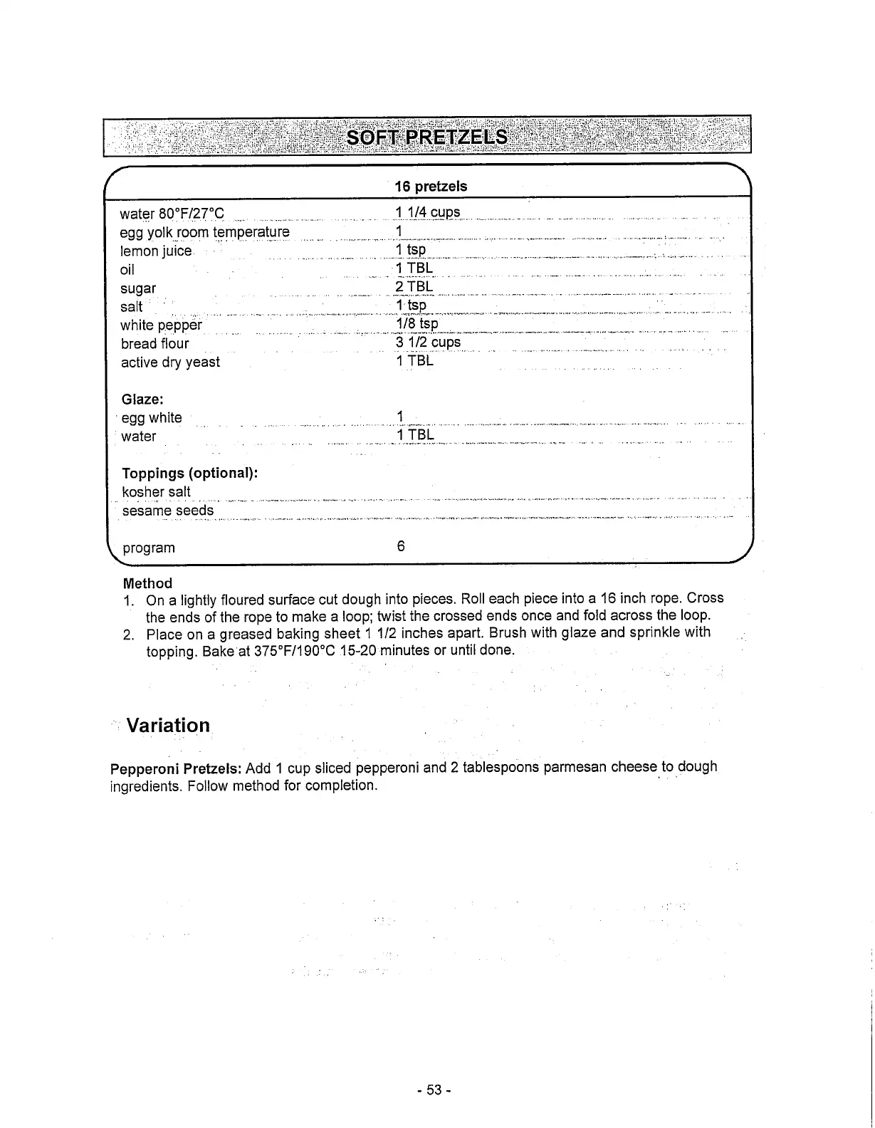 Toastmaster 1187S - Dough Recipe: Soft Pretzels; Soft Pretzels Preparation; Soft Pretzels Variation