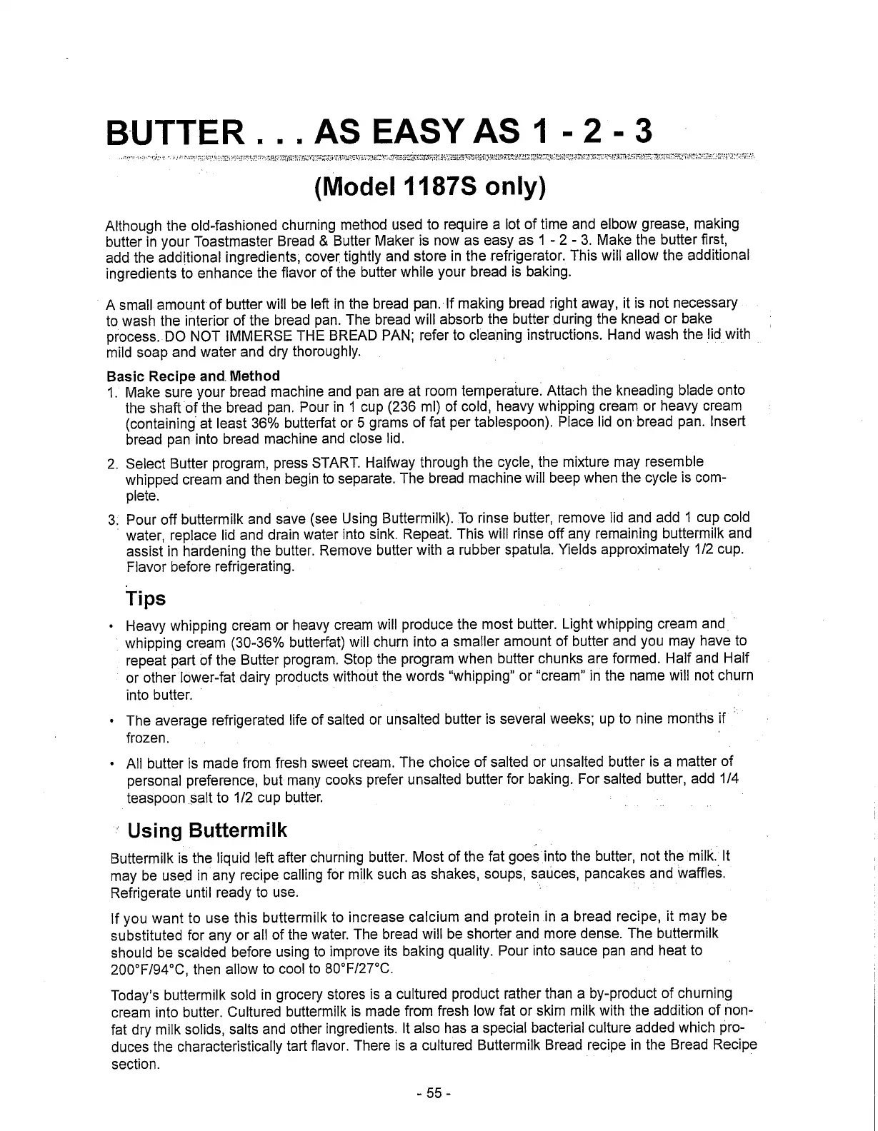 Toastmaster 1187S - Butter... As Easy As 1-2-3; Basic Butter Making Method; Tips for Butter Making; Using Buttermilk