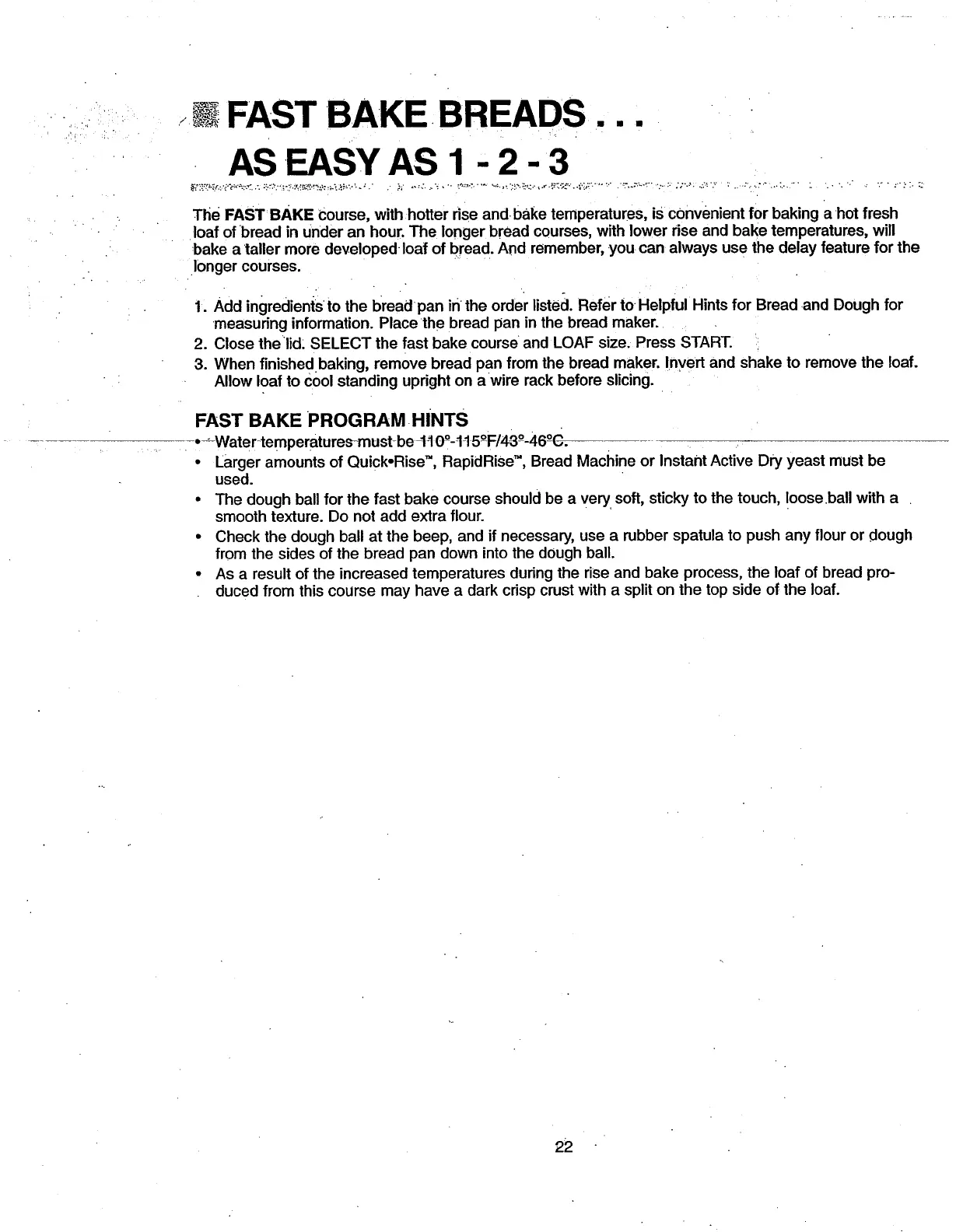 Toastmaster BREAD BOX 1142 - Fast Bake Breads; Fast Bake Program Hints