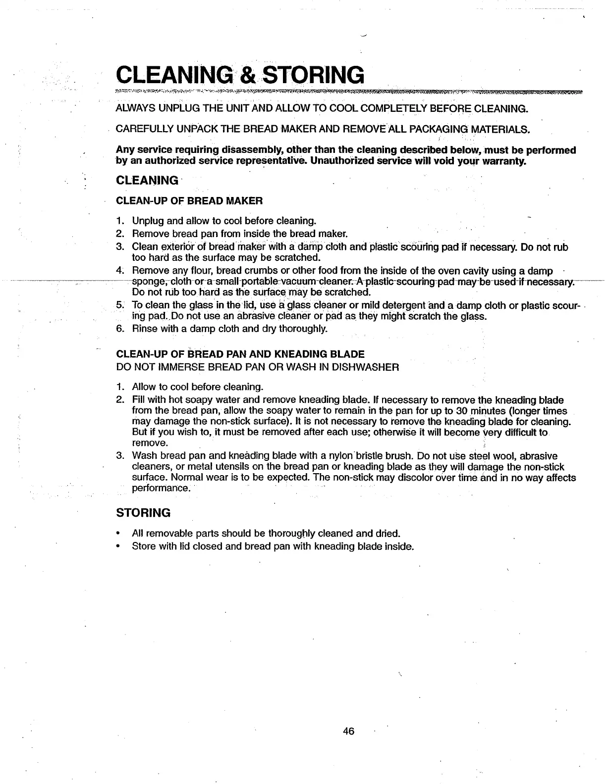 Toastmaster BREAD BOX 1142 - Cleaning & Storing; Clean-Up of Bread Pan and Kneading Blade