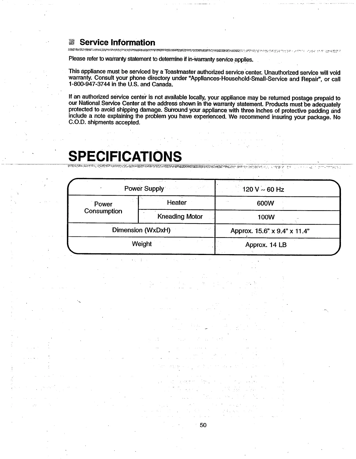Toastmaster BREAD BOX 1142 - Specifications