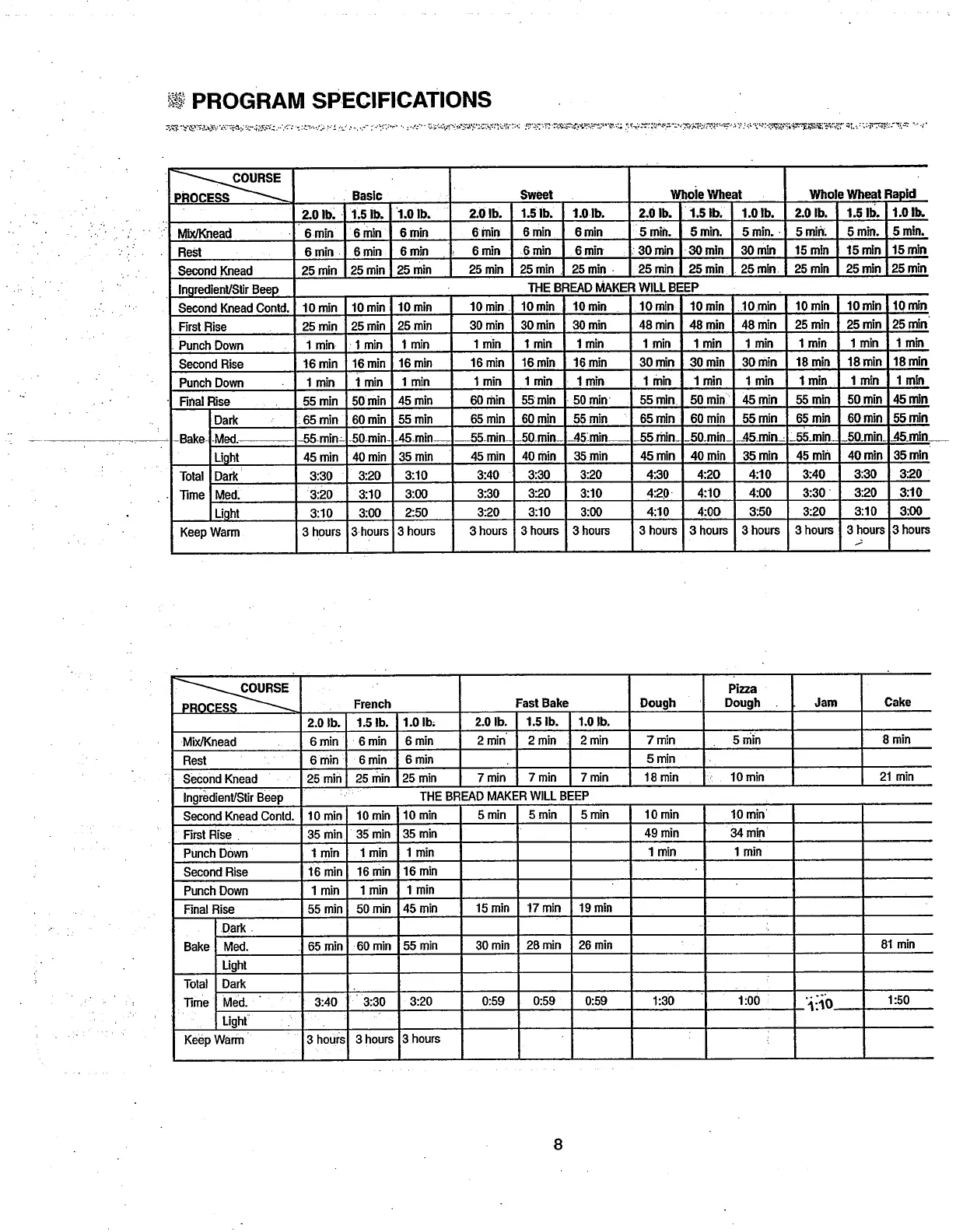 Toastmaster BREAD BOX 1142 - Program Specifications