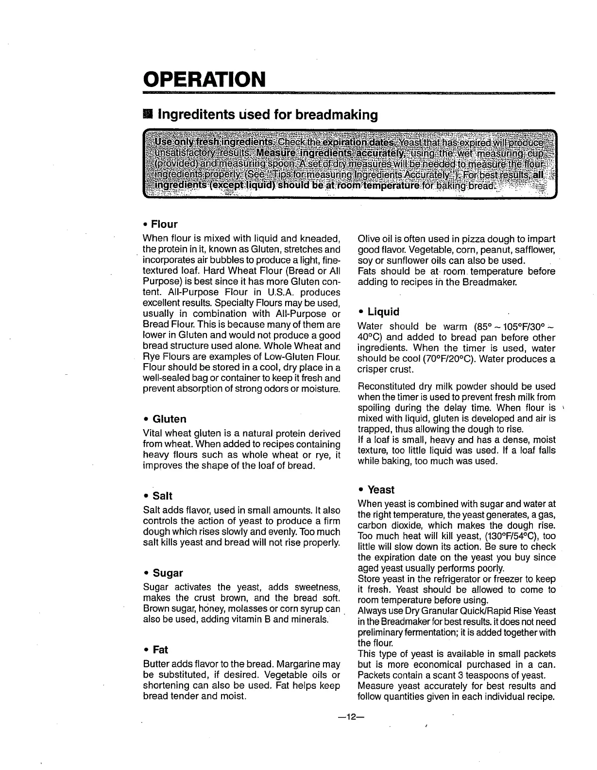 Toastmaster Bread Box 1150 - Operation and Ingredients; Guide to Breadmaking Ingredients